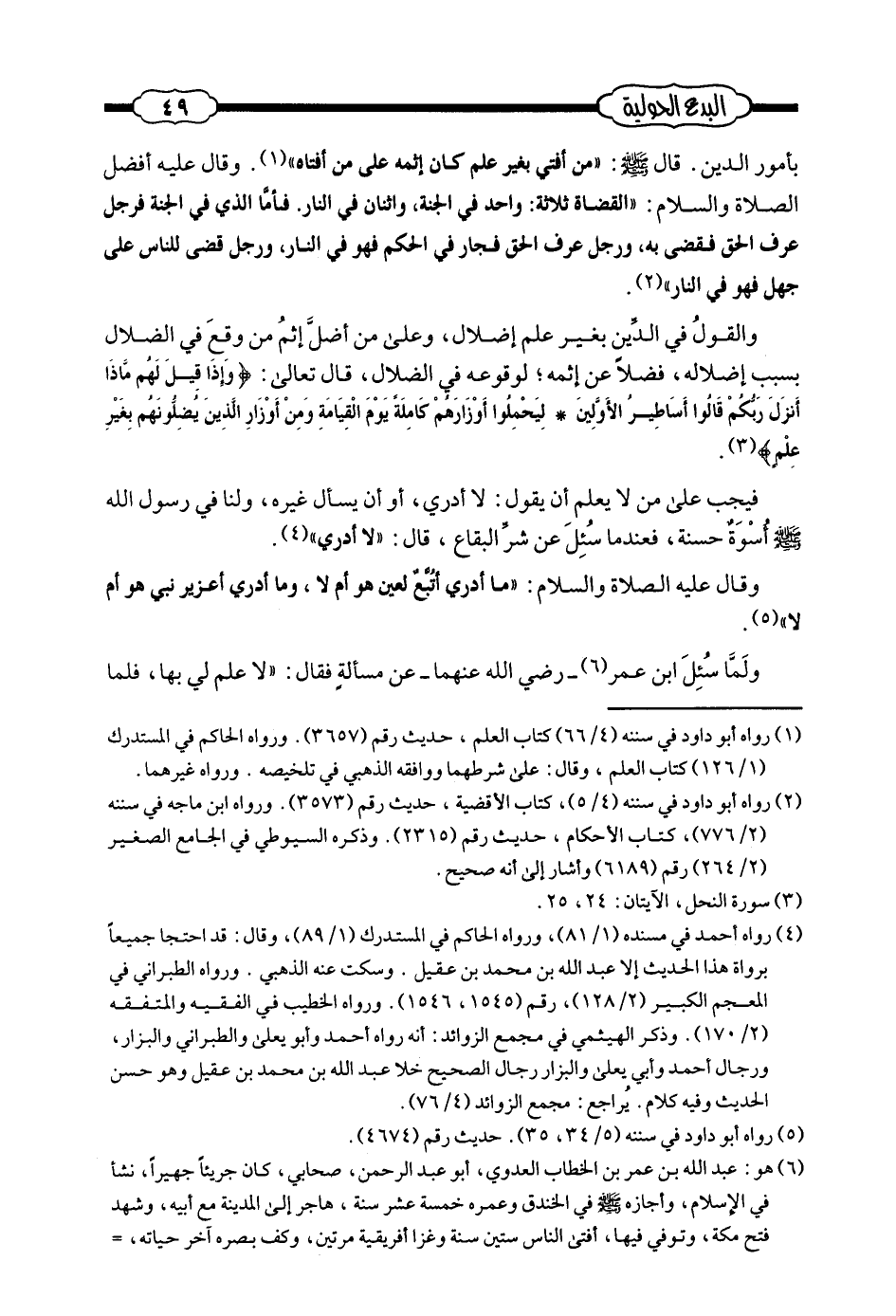 (¬4) - رواه أحمد في مسنده (1/81) ، ورواه الحاكم في المستدرك (1/89) ، وقال: قد احتجا جميعاً برواة هذا الحديث إلا عبد الله بن محمد بن عقيل. وسكت عنه الذهبي. ورواه الطبراني في المعجم الكبير (2/128) ، رقم (1545، 1546) . ورواه الخطيب في الفقيه والمتفقه (2/170) . وذكر الهيثمي في مجمع الزوائد: أنه رواه أحمد وأبو يعلى والطبراني والبزار، ورجال أحمد وأبي يعلى والبزار رجال الصحيح خلا عبد الله بن محمد بن عقيل وهو حسن وفيه كلام. يراجع: مجمع الزوائد (4/76) .