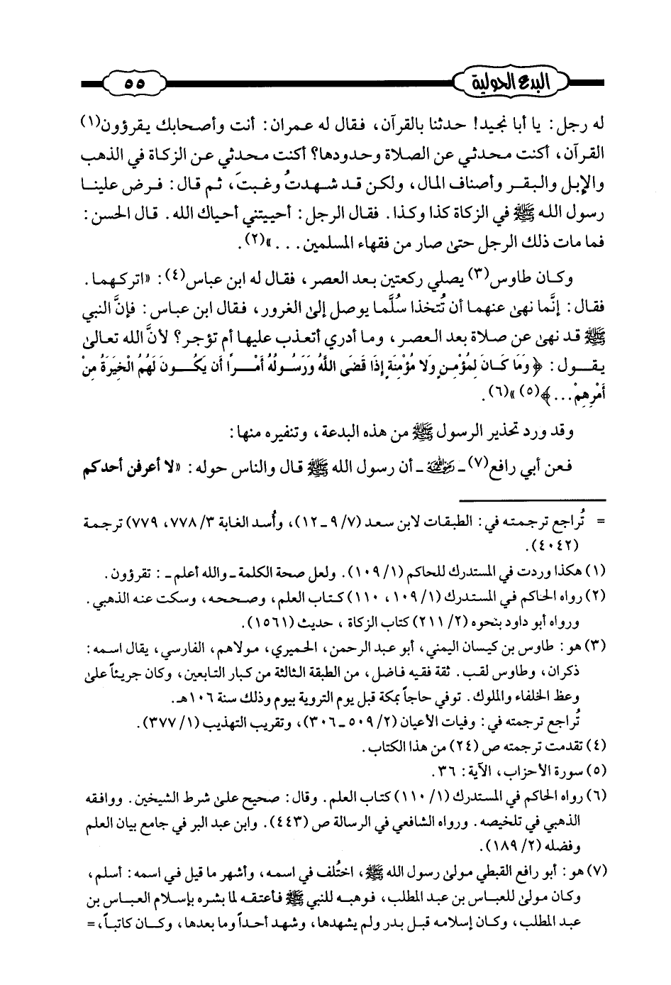 وكان طاوس يصلي ركعتين بعد العصر، فقال له ابن عباس: ((اتركهما. فقال: إنَّما نهى عنهما أن تُتخذا سُلَّما يوصل إلى الغرور، فقال ابن عباس: فإنَّ النبي صلى الله عليه وسلم قد نهى عن صلاة بعد العصر، وما أدري أتعذب عليها أم تؤجر؟ لأنَّ الله تعالى يقول: {وَمَا كَانَ لِمُؤْمِنٍ وَلا مُؤْمِنَةٍ إِذَا قَضَى اللَّهُ وَرَسُولُهُ أَمْراً أَنْ يَكُونَ لَهُمُ الْخِيَرَةُ مِنْ أَمْرِهِمْ..} (¬3)) (¬4) .