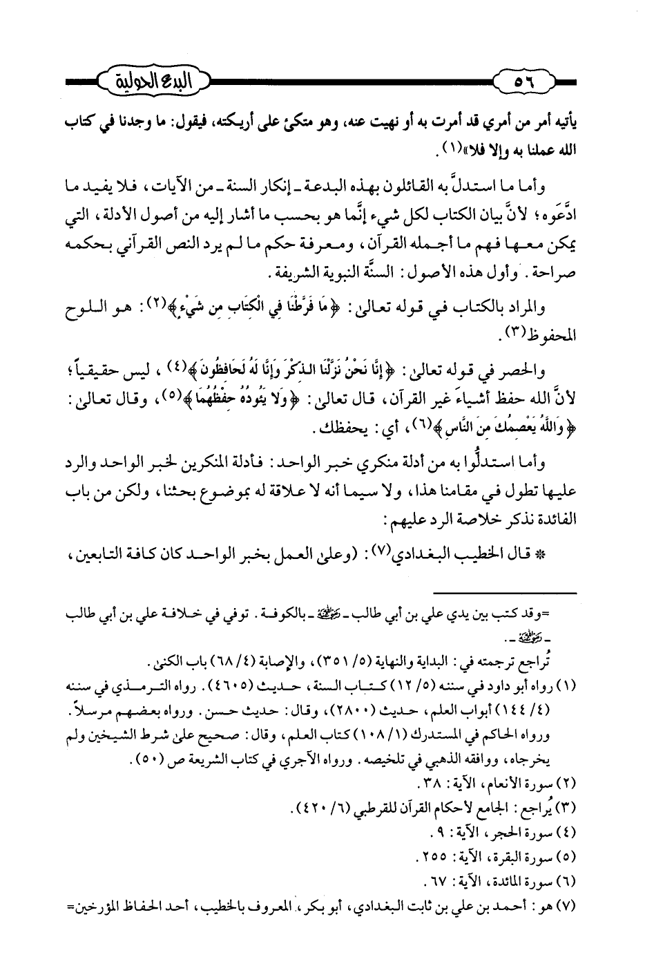 وأما ما استدلَّ به القائلون بهذه البدعة - إنكار السن - من الآيات، فلا يفيد ما ادعَّوه؛ لأنَّ بيان الكتاب لكل شيء إنما هو بحسب ما أشار إليه من أصول الأدلة، التي يمكن معها فهم ما أجمله القرآن، ومعرفة حكم ما لم يرد النص القرآني بحكمه صراحة. وأول هذه الأصول: السنة النبوية الشريفة.