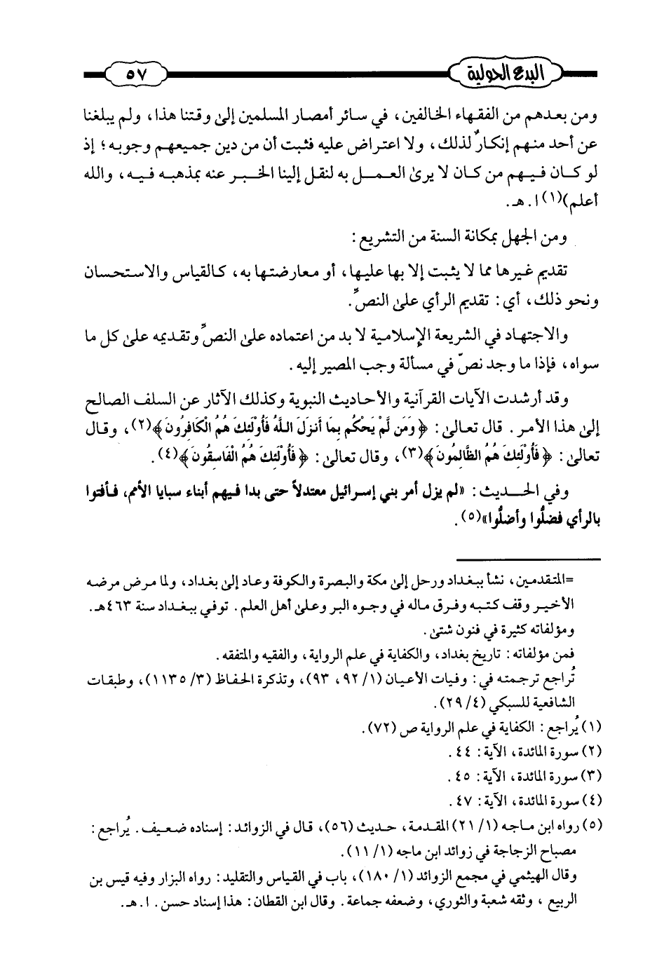 (¬5) - رواه ابن ماجه (1/21) المقدمة، حديث (56) ، قال في الزوائد: إسناده ضعيف. يُراجع: مصباح الزجاجة في زوائد ابن ماجه (1/11) .
