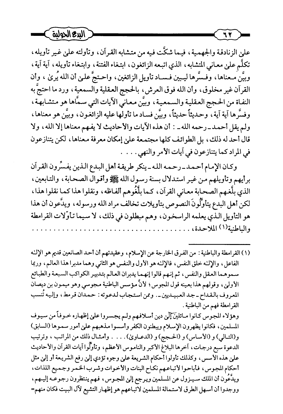 (¬1) - القرامطة والباطنية: من الفرق الخارجة عن الإسلام، وعقيدتهم أن أحد الصانعين قديم هو الإله الفاعل، والإله خلق النفس، فالإله هو الأول والنفس هو الثاني وهما مدبرا هذا العالم، وربما سموهما العقل والنفس، ثم إنهم قالوا إنهما يدبران العالم بتدبير الكواكب السبعة والطبائع الأولى، وقولهم هذا بعينه قول المجوس؛ لأنَّ مؤسس الباطنية مجوسي وهو ميمون بن ديصان المعروف بالقداح - جد العبيديين -. وممن استجاب لدعوته: حمدان قرمط، وإليه تنسب القرامطة فهم من الباطنية.
