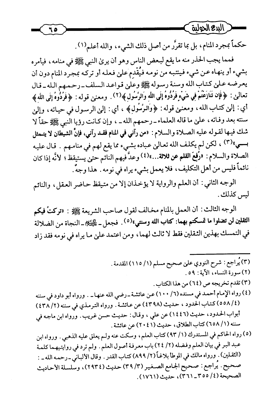 فمما يجب الحذر منه ما يقع لبعض الناس وهو أن يرى النبي صلى الله عليه وسلم في منامه، فيأمره بشيء أو ينهاه عن شيء فينتبه من نومه فيُقْدمِ على فعله أو تركه بمجرد المنام دون أن يعرضه على كتاب الله وسنة رسوله صلى الله عليه وسلم وعلى قواعد السلف - رحمهم الله - قال تعالى: {فَإِنْ تَنَازَعْتُمْ فِي شَيْءٍ فَرُدُّوهُ إِلَى اللَّهِ وَالرَّسُولِ} (¬2) . ومعنى قوله: {فَرُدُّوهُ إِلَى اللَّهِ} أي: إلى كتاب الله، ومعنى قوله: {وَالرَّسُولِ} ، أي: إلى الرسول في حياته، وإلى سنته بعد وفاته، على ما قاله العلماء - رحمهم الله -، وإن كانت رؤيا النبي صلى الله عليه وسلم حقاً لا شك فيها لقوله عليه الصلاة والسلام: ((من رآني في المنام فقد رآني، فإن الشيطان لا يتمثل بي)) (¬3) . لكن لم يكلف الله تعالى عباده بشيء مما يقع لهم في منامهم. قال عليه الصلاة والسلام: ((رُفِع القلم عن ثلاثة..)) (¬4) وعدَّ فيهم النائم حتى يستيقظ؛ لأنَّه إذا كان نائماً فليس من أهل التكليف، فلا يعمل بشيء يراه في نومه