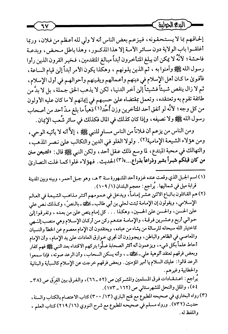 . ولولا الغلو في الدين والتكالب على نصر المذهب، والتهالك في محبة المبتدع، لما وسع ذلك عقل أحد، ولكن النبي صلى الله عليه وسلم قال: ((لتتبعن سنن من كان قبلكم شبراً بشبر وذراعاً بذراع ... )) (¬3) الحديث. فهؤلاء غلوا كما غلت النصارى