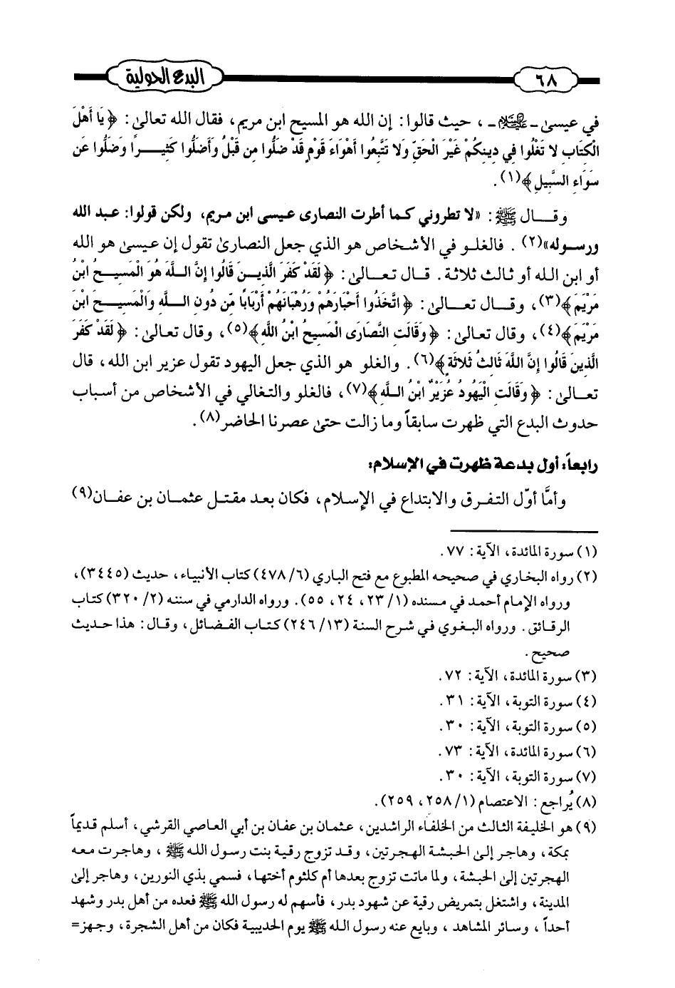 وقال صلى الله عليه وسلم: ((لا تطروني كما أطرت النصارى عيسى ابن مريم، ولكن قولوا: عبد الله ورسوله)) (¬2) . فالغلو في الأشخاص هو الذي جعل النصارى تقول إن عيسى هو الله أو ابن الله أو ثالث ثلاثة. قال تعالى: {لَقَدْ كَفَرَ الَّذِينَ قَالُوا إِنَّ اللَّهَ هُوَ الْمَسِيحُ ابْنُ مَرْيَمَ} (¬3) قال تعالى: {اتَّخَذُوا أَحْبَارَهُمْ وَرُهْبَانَهُمْ أَرْبَاباً مِنْ دُونِ اللَّهِ وَالْمَسِيحَ ابْنَ مَرْيَمَ} (¬4) قال تعالى: {وَقَالَتِ النَّصَارَى الْمَسِيحُ ابْنُ اللَّهِ} (¬5) قال تعالى: {لَقَدْ كَفَرَ الَّذِينَ قَالُوا إِنَّ اللَّهَ ثَالِثُ ثَلاثَةٍ} (¬6) . والغلو هو الذي جعل اليهود تقول عزير ابن الله، قال تعالى: {وَقَالَتِ الْيَهُودُ عُزَيْرٌ ابْنُ اللَّهِ} (¬7) ، الغلو والتغالي في الأشخاص من أسباب حدوث البدع ظهرت سابقاً وما زالت حتى عصرتنا الحاضر (¬8)