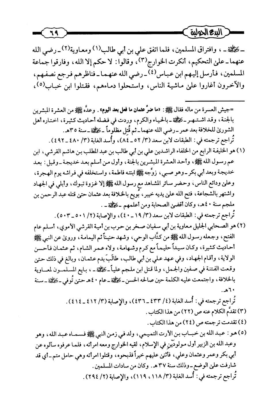 -رضي الله عنه-، وافتراق المسلمين، فلما اتفق علي بن أبي طالب ومعاوية- رضي الله عنهما-على التحكيم، أنكرت الخوارج، وقالوا: لا حكم إلا الله، وفارقوا جماعة المسلمين، فأرسل إليهم ابن عباس- رضي الله عنهما- فناظرهم فرجع نصفهم، والآخرون أغاروا على ماشية الناس، واستحلوا دماءهم، فقتلوا ابن خباب،