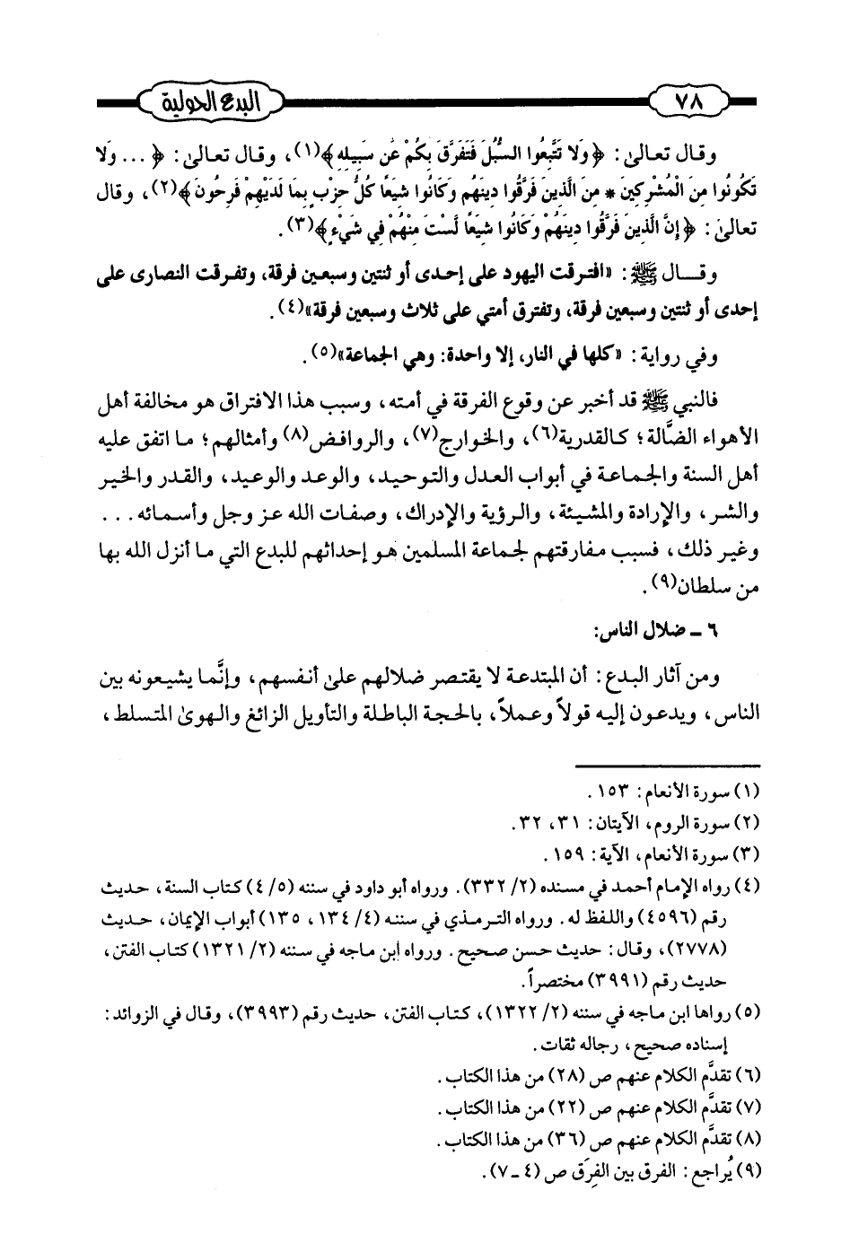 وقال تعالى: {وَلا تَتَّبِعُوا السُّبُلَ فَتَفَرَّقَ بِكُمْ عَنْ سَبِيلِهِ} (¬1) ، وقال تعالى: {..وَلا تَكُونُوا مِنَ الْمُشْرِكِينَ * مِنَ الَّذِينَ فَرَّقُوا دِينَهُمْ وَكَانُوا شِيَعاً كُلُّ حِزْبٍ بِمَا لَدَيْهِمْ فَرِحُونَ} (¬2) ، وقال تعالى: {إِنَّ الَّذِينَ فَرَّقُوا دِينَهُمْ وَكَانُوا شِيَعاً لَسْتَ مِنْهُمْ فِي شَيْءٍ} (¬3) .