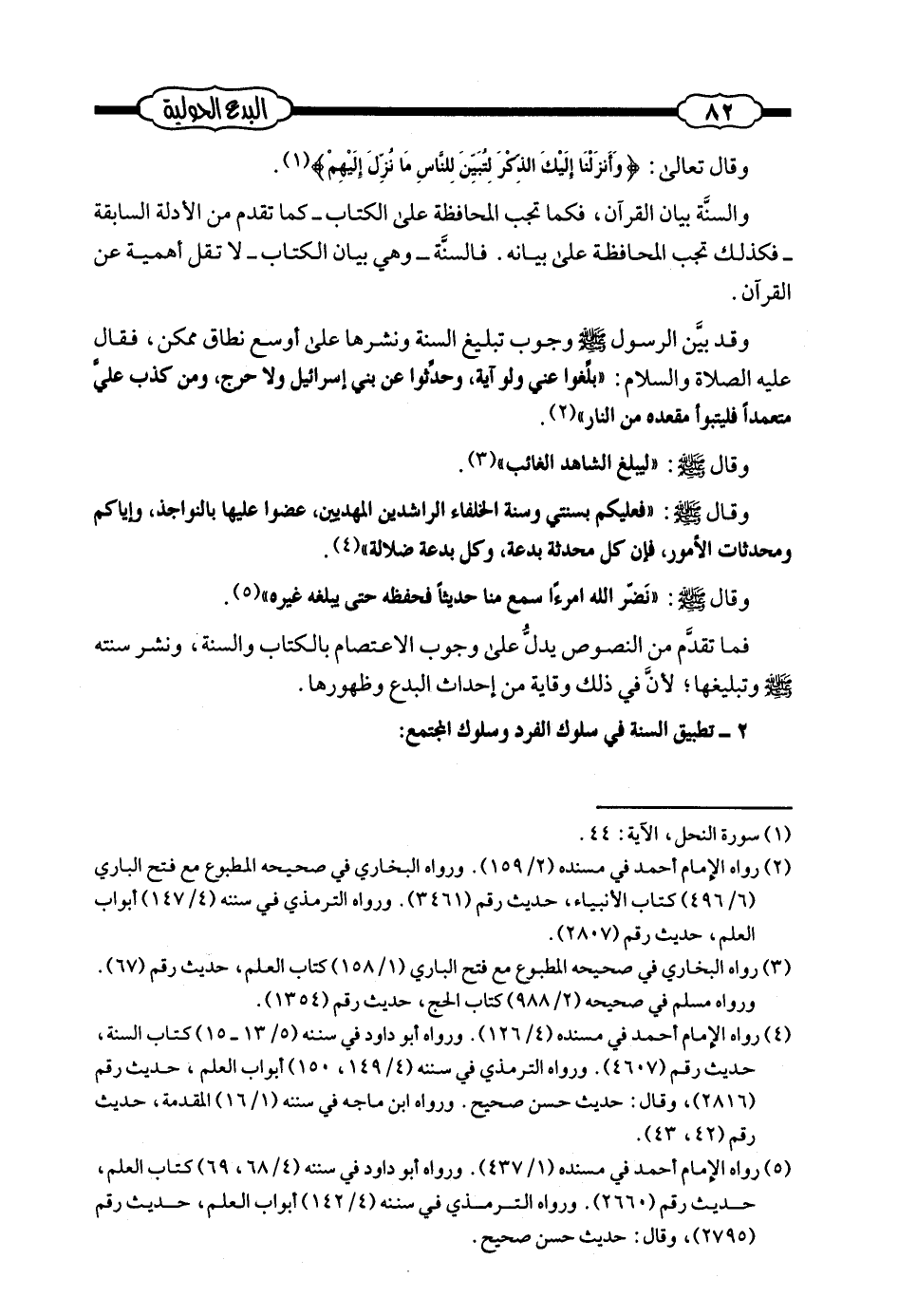 (¬4) - رواه الإمام أحمد في مسنده (4/126) . ورواه أبو داود في سننه (5/13-15) كتاب السنة، حديث رقم (4607) . ورواه الترمذي في سننه (4/149، 150) أبواب العلم، حديث رقم (2816) ، وقال: حديث حسن صحيح. ورواه ابن ماجه في سننه (1/ 16) ، المقدمة، حديث رقم (42، 43) .