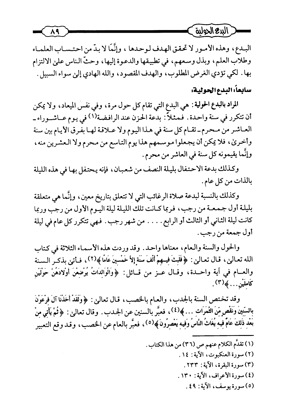المراد بالبدع الحولية: هي البدع التي تقام كل حول مرة، وفي نفس الميعاد، ولا يمكن أن تتكرر في سنة واحدة. فمثلاً: بدعة الحزن عند الرافضة في يوم عاشوراء - العاشر من محرم - تقام كل سنة في هذا اليوم ولا علاقة لها بفرق الأيام بين سنة وأخرى، فلا يمكن أن يجعلوا موسمهم هذا يوم التاسع من محرم ولا العشرين منه، وإنما يقيمونه كل سنة في العشر من محرم.