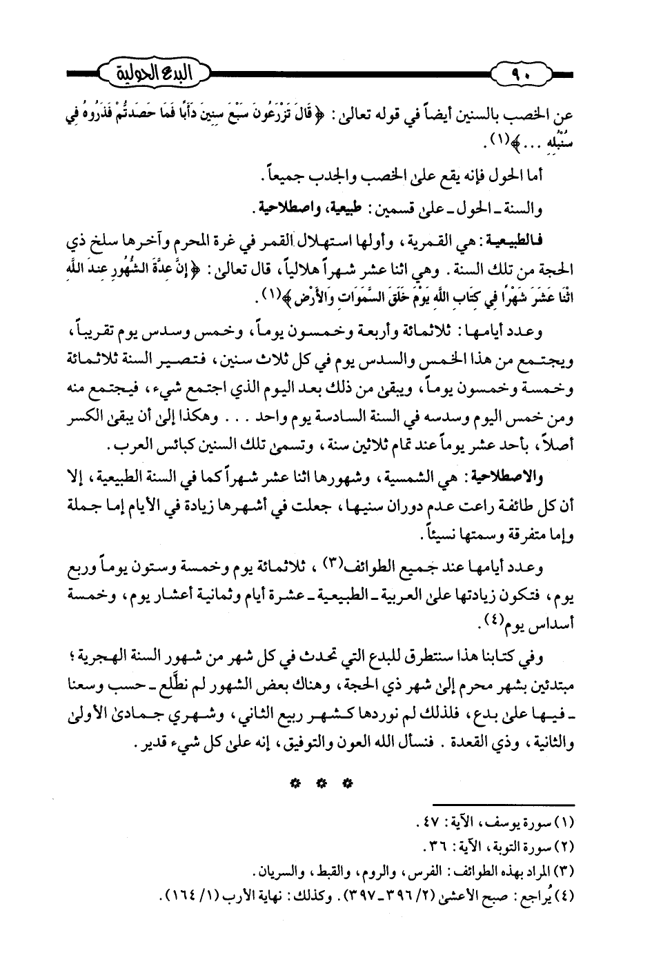 فالطبيعة: هي القمرية، وأولها استهلال القمر في غرة المحرم وآخرها سلخ ذي الحجة من تلك السنة. وهي اثنا عشر شهراً هلالياً، قال تعالى: {إِنَّ عِدَّةَ الشُّهُورِ عِنْدَ اللَّهِ اثْنَا عَشَرَ شَهْراً فِي كِتَابِ اللَّهِ يَوْمَ خَلَقَ السَّمَاوَاتِ وَالْأَرْضَ} (¬2) .