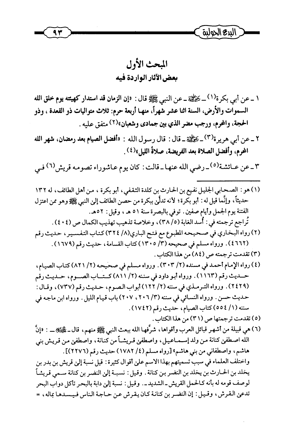 عن أبي بكرة - رضي الله-عن النبي صلى الله عليه وسلم قال: ((إن الزمان قد استدار كهيئته يوم خلق الله السماوات والأرض، والسنة اثنا عشر شهراً، منها أربعة حرم: ثلاث متواليات ذو القعدة وذو الحجة والمحرم، ورجب مضر الذي بين جمادى وشعبان)) الحديث. متفق عليه (¬1) .
