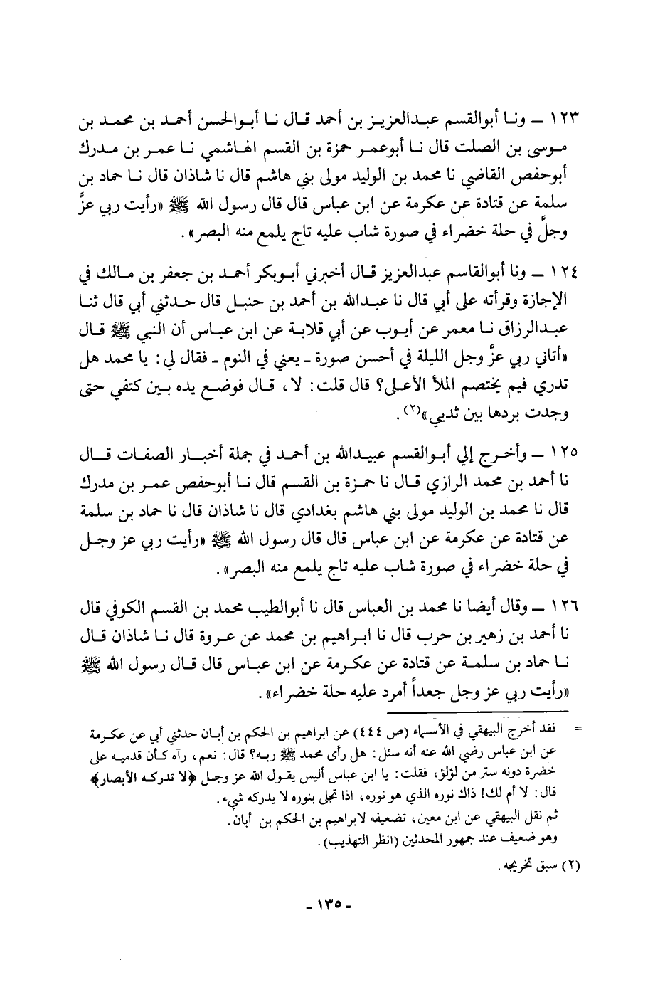 125 - وأخرج إلي أَبُو القسم عبيد الله بن أَحْمَد فِي جملة أخبار الصفات، قَالَ: نا أَحْمَد بن مُحَمَّد الرازي، قَالَ: نا حمزة بن القسم، قَالَ: نا أَبُو حفص عمر بن مدرك، قَالَ: نا مُحَمَّد بن الوليد مولى بني هاشم بغدادي، قَالَ: نا شاذان، قَالَ: نا حَمَّاد بن سلمة، عن قتادة، عن عكرمة، عن ابن عباس، قَالَ: قَالَ رسول الله، صَلَّى اللَّهُ عَلَيْهِ وَسَلَّمَ: " رأيت ربي، عَزَّ وَجَلَّ، فِي حلة خضراء فِي صورة شاب عليه تاج يلمع منه البصر "