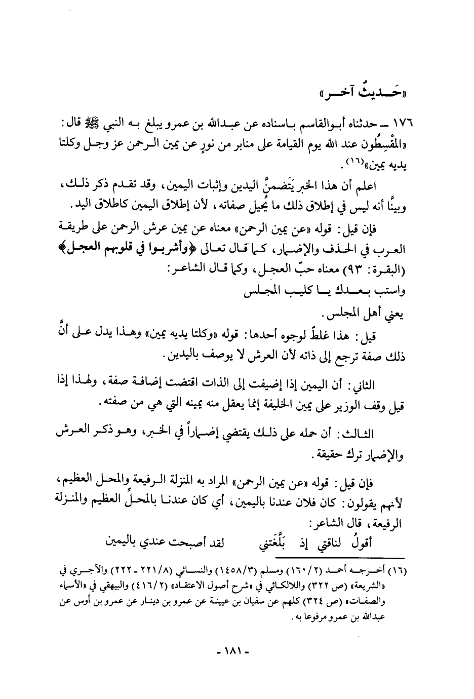 وكلتا يديه يمين " أعلم أن هَذَا الخبر يتضمن اليدين وإثبات اليمين، وقد تقدم ذكر ذَلِكَ، وبينا أنه ليس فِي إطلاق ذَلِكَ ما يحيل صفاته، لأن إطلاق اليمين كإطلاق اليد فإن قيل: قوله: " عن يمين الرحمن " معناه عن يمين عرش الرحمن عَلَى طريقة العرب فِي الحذف والإضمار، كما قَالَ تَعَالَى: {وَأُشْرِبُوا فِي قُلُوبِهِمُ الْعِجْلَ} معناه حب العجل، وكما قَالَ الشاعر: واستب بعدك يا كليب المجلس يعني أهل المجلس قيل: هَذَا غلط لوجوه أحدها: قوله: " وكلتا يديه يمين " وهذا يدل عَلَى أن ذَلِكَ صفة ترجع إلى ذاته لأن العرش لا يوصف باليدين الثاني: أن اليمين إذا إضيفت إلى الذات اقتضت إضافة صفة، ولهذا إذا قيل: وقف الوزير عَلَى يمين الخليفة إنما يعقل منه يمينه التي هي من صفته الثالث: أن حمله عَلَى ذَلِكَ يقتضي إضمارا فِي الخبر، وهو ذكر العرش والإضمار ترك حقيقة فإن قيل: قوله: " عن يمين الرحمن " المراد به المنزلة الرفيعة والمحل العظيم، لأنهم يقولون: كان فلان عندنا باليمين، أي كان عندنا بالمحل العظيم والمنزلة الرفيعة، قَالَ الشاعر: