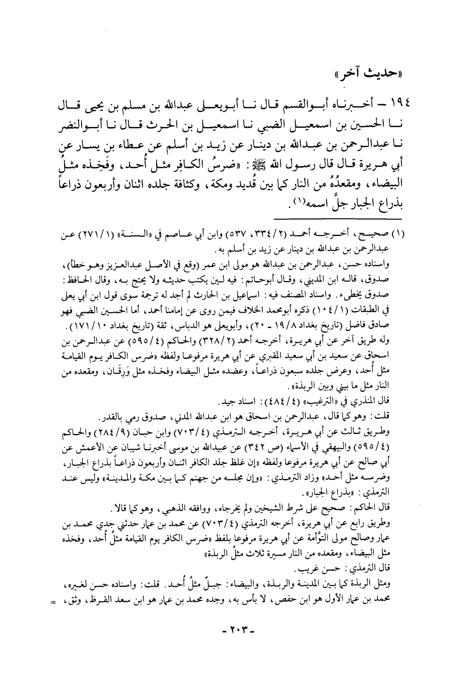 194 - أَخْبَرَنَاهُ أَبُو الْقَاسِمِ، قَالَ: نا أَبُو يَعْلَى عَبْدُ اللَّهِ بْنُ مُسْلِمِ بْنِ يَحْيَى، قَالَ: نا الْحُسَيْنُ بْنُ إِسْمَاعِيلَ الضَّبِّيُّ، نا إِسْمَاعِيلُ بْنُ الْحَارِثِ، قَالَ: نا أَبُو النَّضْرِ، نا عَبْدُ الرَّحْمَنِ بْنُ عَبْدِ اللَّهِ بْنِ دِينَارٍ، عَنْ زَيْدِ بْنِ أَسْلَمَ، عَنْ عَطَاءِ بْنِ يَسَارٍ، عَنْ أَبِي هُرَيْرَةَ، قَالَ: قَالَ رَسُولُ اللَّهِ، صَلَّى اللَّهُ عَلَيْهِ وَسَلَّمَ: " ضِرْسُ الْكَافِرِ مِثْلُ أُحُدٍ، وَفَخِذُهُ مِثْلُ الْبَيْضَاءِ، وَمَقْعَدُهُ مِنَ النَّارِ كَمَا بَيْنَ قُدَيْدٍ وَمَكَّةَ، وَكَثَافَةُ جِلْدِهِ اثْنَانِ وَأَرْبَعُونَ ذِرَاعًا بِذِرَاعِ الْجَبَّارِ، جَلَّ اسْمُهُ "
