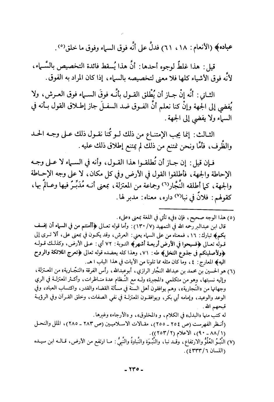 كان المراد به الفوق الثاني: أنه إن جاز أن يطلق القول بأنه فوق السماء فوق العرش، ولا يفضي إلى الجهة وإن كنا نعلم أن الفوق ضد السفل جاز إطلاق القول بأنه فِي السماء ولا يفضي إلى الجهة الثالث: إنما يجب الامتناع من ذَلِكَ لو كنا نقول ذَلِكَ عَلَى وجه الحد والظرف، فإما ونحن نمتنع من ذَلِكَ لم يمتنع إطلاق ذَلِكَ عليه فإن قيل: إن جاز أن تطلقوا هَذَا القول، وأنه فِي السماء لا عَلَى وجه الإحاطة والجهة، فأطلقوا القول فِي الأرض وفي كل مكان، لا عَلَى وجه الإحاطة والجهة، كما أطلقه النجار وجماعة من المعتزلة، بمعنى أنه مدبر فيها وعالم بها، كقولهم: فلان فِي نبا داره، معناه: مدبر لها