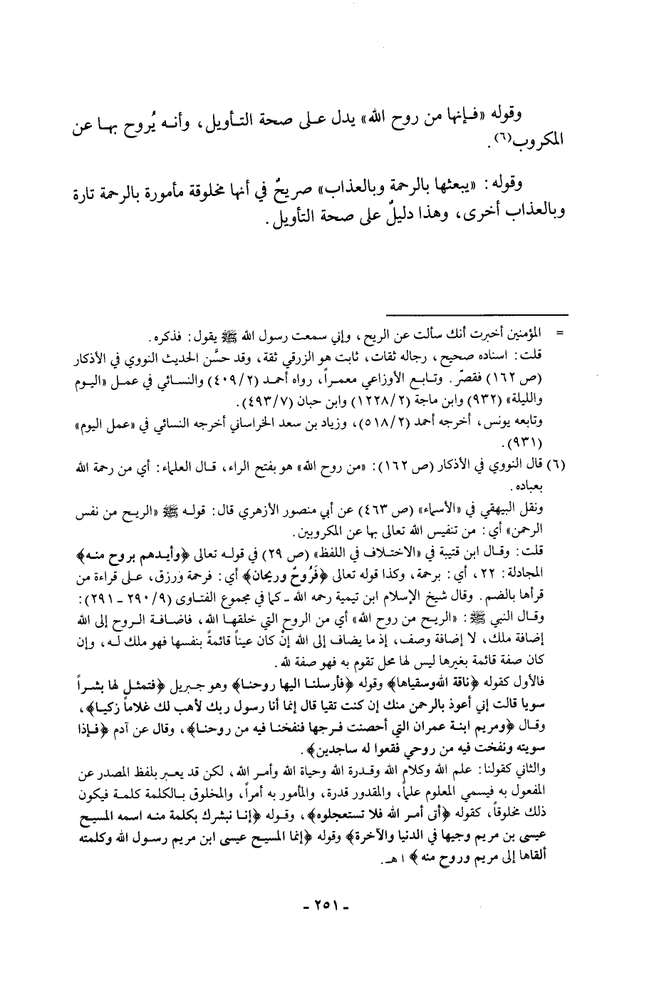 وقوله: " فإنها من روح الله " يدل عَلَى صحة التأويل، وأنه يروح بها عن المكروب وقوله: " يبعثها بالرحمة وبالعذاب " صريح فِي أنها مخلوقة مأمورة بالرحمة تارة وبالعذاب أخرى، وهذا دليل عَلَى صحة التأويل