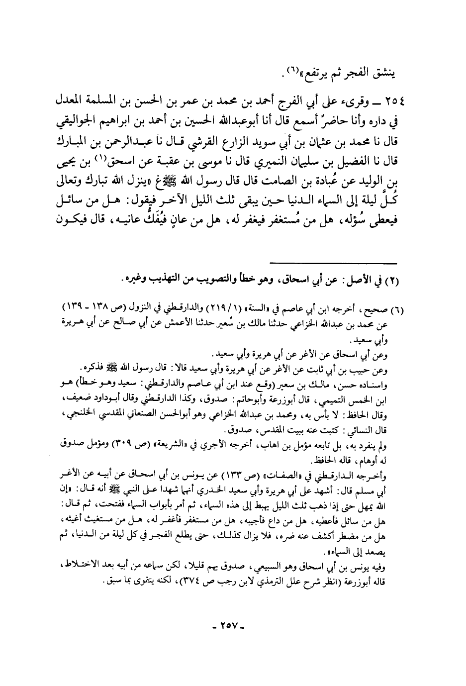 254 - وَقُرِئَ عَلَى أَبِي الْفَرَجِ أَحْمَدَ بْنِ مُحَمَّدِ بْنِ عُمَرَ بْنِ الْحَسَنِ بْنِ الْمُسْلِمَةِ الْمُعَدَّلُ، فِي دَارِهِ وَأَنَا حَاضِرٌ أَسْمَعُ، قَالَ: أنا أَبُو عَبْدِ اللَّهِ الْحُسَيْنُ بْنُ أَحْمَدَ بْنِ إِبْرَاهِيمَ الْجَوَالِيقِيُّ، قَالَ: نا مُحَمَّدُ بْنُ عُثْمَانَ بْنِ أَبِي سُوَيْدٍ الزَّارِعُ الْقُرَشِيُّ، قَالَ: نا عَبْدُ الرَّحْمَنِ بْنُ الْمُبَارَكِ، قَالَ: نا الْفُضَيْلُ بْنُ سُلَيْمَانَ النُّمَيْرِيُّ، قَالَ: نا مُوسَى بْنُ عُقْبَةَ، عَنْ إِسْحَاقَ بْنِ يَحْيَى بْنِ الْوَلِيدِ، عَنْ عُبَادَةَ بْنِ الصَّامِتِ، قَالَ: قَالَ رَسُولُ اللَّهِ، صَلَّى اللَّهُ عَلَيْهِ وَسَلَّمَ: " يَنْزِلُ اللَّهُ، تَبَارَكَ وَتَعَالَى، كُلَّ لَيْلَةٍ إِلَى السَّمَاءِ الدُّنْيَا حِينَ يَبْقَى ثُلُثُ اللَّيْلِ الآخِرِ، فَيَقُولُ: هَلْ مِنْ سَائِلٍ فَيُعْطَى سُؤْلَهُ؟ هَلْ مِنْ مُسْتَغْفِرٍ فَيُغْفَرُ لَهُ؟ هَلْ مِنْ عَانٍ فَيُفَكُّ عَانِيهِ؟ قَالَ: فَيَكُونُ