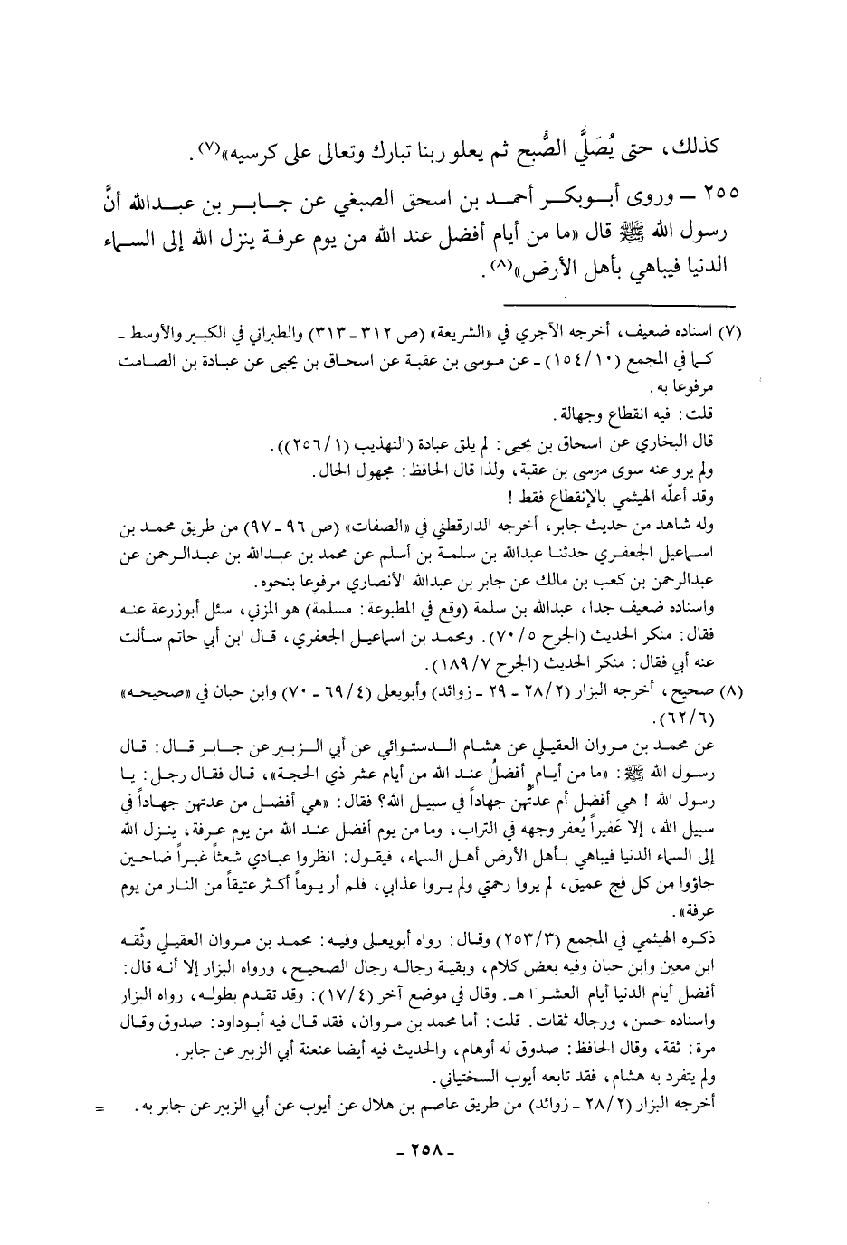 255 - وروى أَبُو بكر أَحْمَد بن إسحاق الصبغي، عن جابر بن عبد الله، أن رسول الله، صَلَّى اللَّهُ عَلَيْهِ وَسَلَّمَ، قَالَ: " ما من أيام أفضل عند الله من يوم عرفة ينزل الله إلى السماء الدنيا فيباهي بأهل الأرض "
