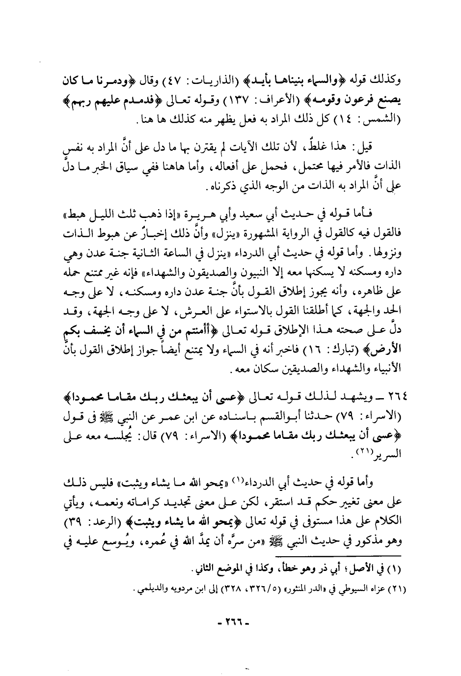 {وَالسَّمَاءَ بَنَيْنَاهَا بِأَيْدٍ} وَقَالَ: {وَدَمَّرْنَا مَا كَانَ يَصْنَعُ فِرْعَوْنُ وَقَوْمُهُ} وقوله تَعَالَى: {فَدَمْدَمَ عَلَيْهِمْ رَبُّهُمْ} كل ذَلِكَ المراد به فعل يظهر منه كذلك هاهنا قيل: هَذَا غلط لأن تِلْكَ الآيات لم يقترن بها ما دل عَلَى أن المراد به نفس الذات فالأمر فيها محتمل، فحمل عَلَى أفعاله، وأما هاهنا ففي سياق الخبر ما دل عَلَى أن المراد به الذات من الوجه الذي ذكرناه فأما قوله فِي حديث أَبِي سعيد وأبي هُرَيْرَةَ: " إذا ذهب ثلث الليل هبط " فالقول فيه كالقول فِي الرواية المشهورة " ينزل " وأن ذَلِكَ إخبار عن هبوط الذات ونزولها، وأما قوله فِي حديث أَبِي الدرداء: " ينزل فِي الساعة الثانية جنة عدن وهي داره ومسكنه لا يسكنها معه إلا النبيون والصديقون والشهداء " فإنه غير ممتنع حمله عَلَى ظاهره، وأنه يجوز إطلاق القول بأن جنة عدن داره ومسكنه، لا عَلَى وجه الحد والجهة، كما أطلقنا القول بالاستواء عَلَى العرش، لا عَلَى وجه الجهة، وقد دل عَلَى صحته هَذَا الإطلاق قوله تَعَالَى: {أَأَمِنْتُمْ مَنْ فِي السَّمَاءِ أَنْ يَخْسِفَ بِكُمُ الأَرْضَ} فأخبر أنه فِي السماء، ولا يمتنع أيضا جواز إطلاق القول بأن الأنبياء والشهداء والصديقين سكان معه