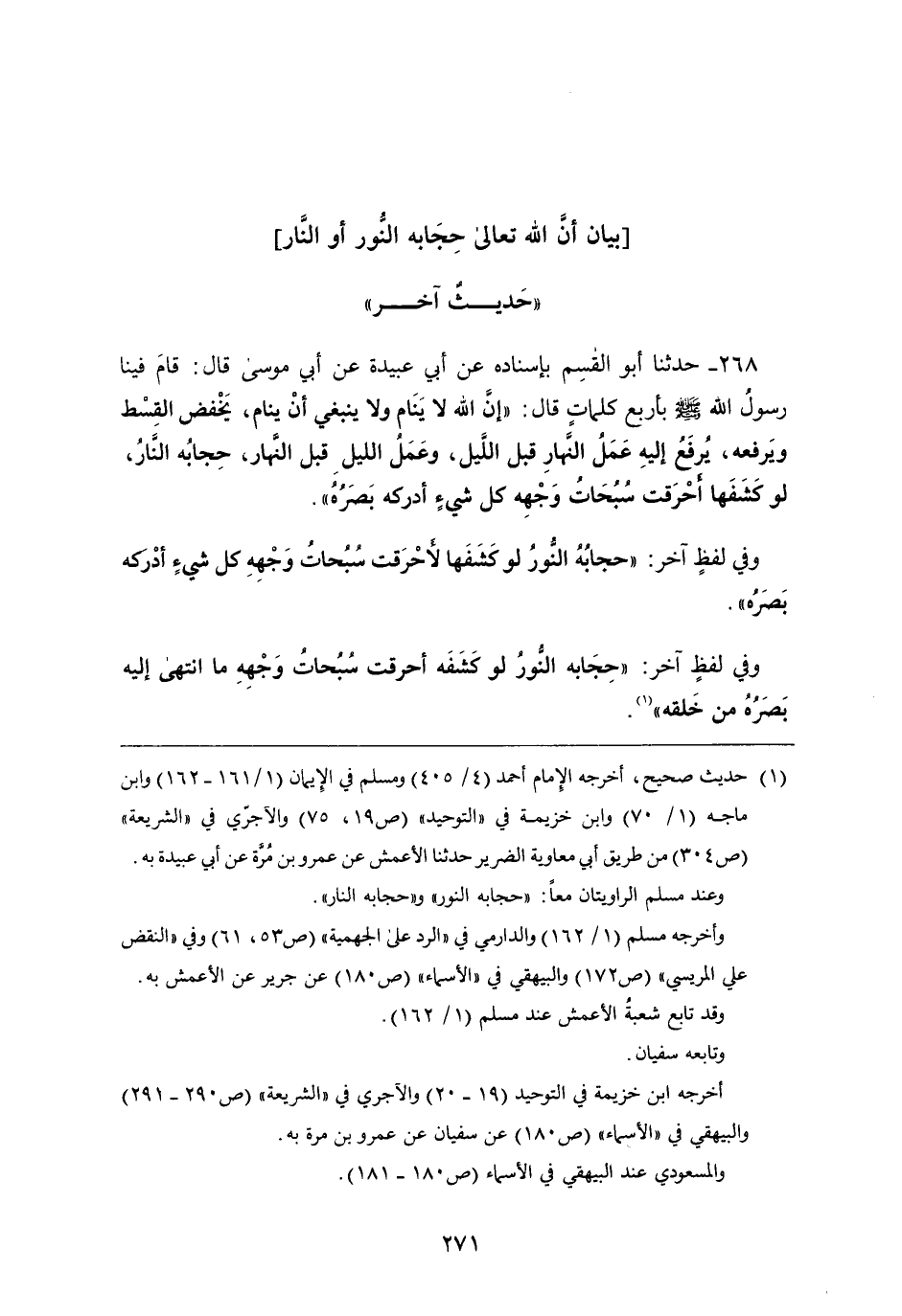 268 - حَدَّثَنَا أَبُو الْقَاسِمِ بِإِسْنَادِهِ، عَنْ أَبِي عُبَيْدَةَ، عَنْ أَبِي مُوسَى قَالَ: قَامَ فِينَا رَسُولُ اللَّهِ صَلَّى اللَّهُ عَلَيْهِ وَسَلَّمَ بِأَرْبَعِ كَلِمَاتٍ قَالَ: " إِنَّ اللَّهَ لا يَنَامُ وَلا يَنْبَغِي أَنْ يَنَامَ، يَخْفِضُ الْقِسْطَ وَيَرْفَعُهُ، يُرْفَعُ إِلَيْهِ عَمَلُ النَّهَارِ قَبْلَ اللَّيْلِ، وَعَمَلُ اللَّيْلِ قَبْلَ النَّهَارِ، حِجَابُهُ النَّارُ، لَوْ كَشَفَهَا أَحْرَقَتْ سُبُحَاتُ وَجْهِهِ كُلَّ شَيْءٍ أَدْرَكَهُ بَصَرُهُ " وَفِي لَفْظٍ آخَرَ: " حِجَابُهُ النُّورُ لَوْ كَشَفَهَا لأَحْرَقَتْ سُبُحَاتُ وَجْهِهِ كُلَّ شَيْءٍ أَدْرَكَهُ بَصَرُهُ " وَفِي لَفْظٍ آخَرَ: " حِجَابُهُ النُّورُ لَوْ كَشَفَهُ أَحْرَقَتْ سُبُحَاتُ وَجْهِهِ مَا انْتَهَى إِلَيْهِ بَصَرُهُ مِنْ خَلْقِهِ "