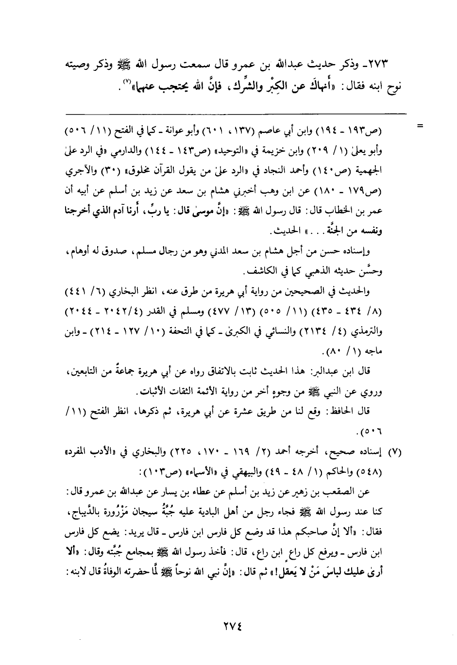 273 - وَذَكَرَ حَدِيثَ عَبْدِ اللَّهِ بْنِ عَمْرٍو، قَالَ: سَمِعْتُ رَسُولَ اللَّهِ صَلَّى اللَّهُ عَلَيْهِ وَسَلَّمَ وَذَكَرَ وَصِيَّتَهُ نُوحٌ ابْنُهُ فَقَالَ: " أَنْهَاكَ عَنِ الْكِبْرِ وَالشِّرْكِ، فَإِنَّ اللَّهَ يَحْتَجِبُ عَنْهُمَا "