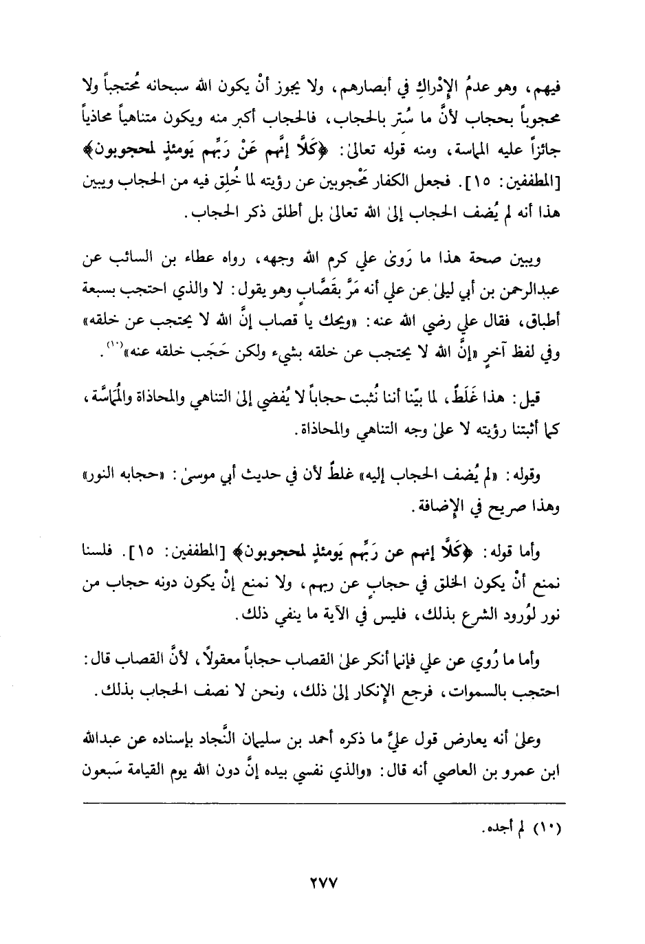 فِيهِمْ، وَهُوَ عَدَمُ الإِدْرَاكِ فِي أَبْصَارِهِمْ، وَلا يَجُوزُ أَنْ يَكُونَ اللَّهُ سُبْحَانَهُ مُحْتَجِبًا وَلا مَحْجُوبًا بِحِجَابٍ لأَنَّ مَا سُتِرَ بِالْحِجَابِ، فَالْحِجَابُ أَكْبَرُ مِنْهُ وَيَكُونُ مُتَنَاهِيًا مُحَاذِيًا جَائِزًا عَلَيْهِ الْمَمَاسَّةُ، وَمِنْهُ قَوْلُهُ تَعَالَى: {كَلَّا إِنَّهُمْ عَنْ رَبِّهِمْ يَوْمَئِذٍ لَمَحْجُوبُونَ} فَجَعَلَ الْكُفَّارَ مَحْجُوبِينَ عَنْ رُؤْيَتِهِ لِمَا خُلِقَ فِيهِ مِنَ الْحِجَابِ، وَيُبَيِّنُ هَذَا أَنَّهُ لَمْ يُضِفِ الْحِجَابَ إِلَى اللَّهِ تَعَالَى بَلْ أَطْلَقَ ذِكْرَ الْحِجَابِ وَيُبَيِّنُ صِحَّةُ هَذَا مَا رَوَى عَلِيٌّ كَرَّمَ اللَّهُ وَجْهَهُ، رَوَاهُ عَطَاءُ بْنُ السَّائِبِ، عَنْ عَبْدِ الرَّحْمَنِ بْنِ أَبِي لَيْلَى، عَنْ عَلِيٍّ أَنَّهُ مَرَّ بِقَصَّابٍ وَهُوَ يَقُولُ: لا وَالَّذِي احْتَجَبَ بِسَبْعَةِ أَطْبَاقٍ، فَقَالَ
