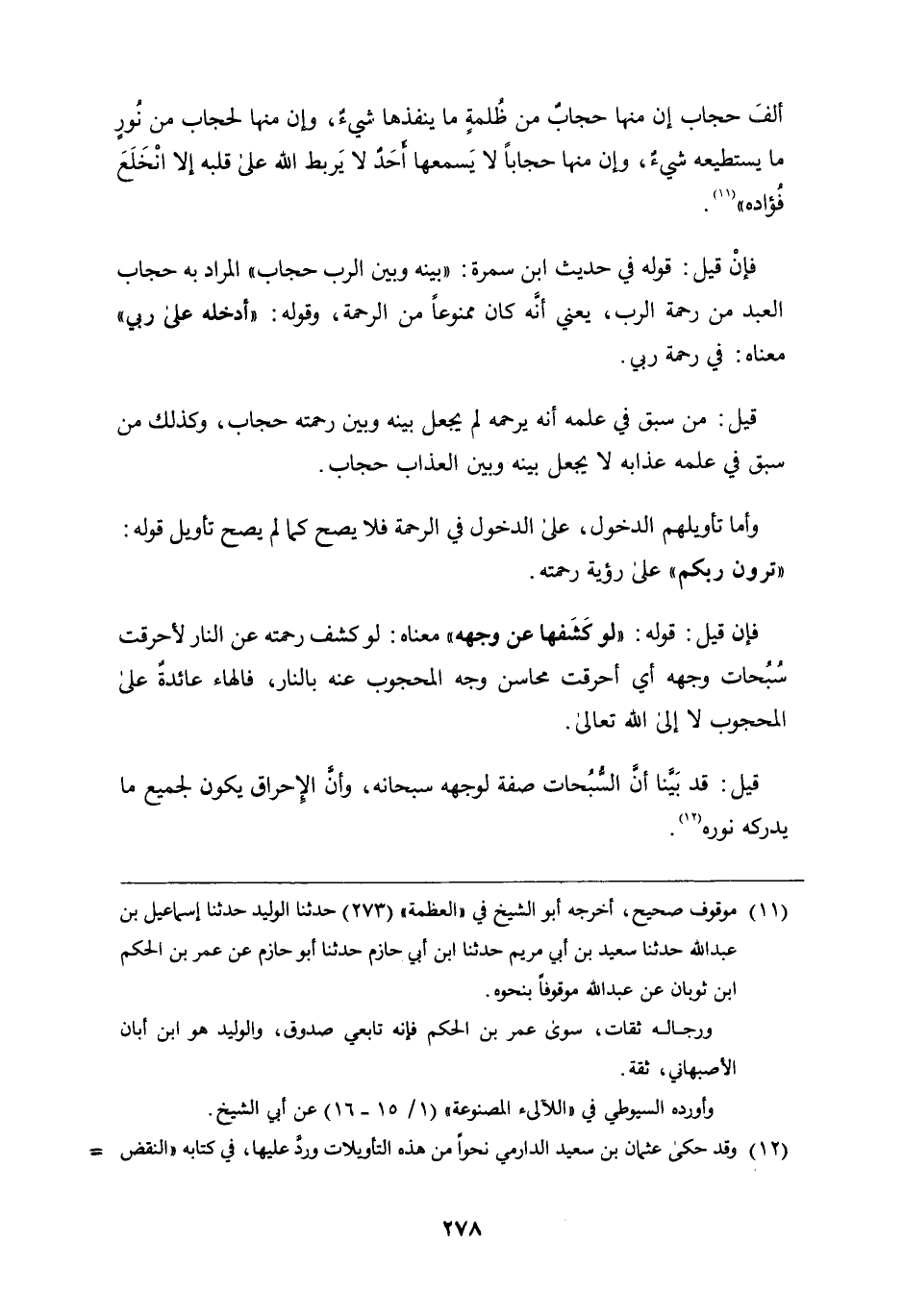 : قَوْلُهُ فِي حَدِيثِ ابْنِ سَمُرَةَ: " بَيْنَهُ وَبَيْنَ الرَّبِّ حِجَابٌ " الْمُرَادُ بِهِ حِجَابُ الْعَبْدِ مِنْ رَحْمَةِ الرَّبِّ، يَعْنِي أَنَّهُ كَانَ مَمْنُوعًا مِنَ الرَّحْمَةِ، وَقَوْلُهُ: " أَدْخَلَهُ عَلَى رَبِّي " مَعْنَاهُ: فِي رَحْمَةِ رَبِّي قِيلَ: مَنْ سَبَقَ فِي عَمِلِه أَنَّهُ يَرْحَمُهُ لَمْ يَجْعَلْ بَيْنَهُ وَبَيْنَ رَحْمَتِهِ حِجَابٌ، وَكَذَلِكَ مَنْ سَبَقَ فِي عَمَلِهِ عَذَابُهُ لا يَجْعَلُ بَيْنَهُ وَبَيْنَ الْعَذَابِ حِجَابٌ وَأَمَّا تَأْوِيلُهُمُ الدُّخُولِ، عَلَى الدُّخُولِ فِي الرَّحْمَةِ فَلا يَصِحُّ كَمَا لَمْ يَصِحَّ تَأْوِيلُ قَوْلِهِ: " تَرَوْنَ رَبَّكُمْ " عَلَى رُؤْيَةِ رَحْمَتِهِ فَإِنْ قِيلَ: قَوْلُهُ: " لَوْ كَشَفَهَا عَنْ وَجْهِهِ " مَعْنَاهُ: لَوْ كَشَفَ رَحْمَتَهُ عَنِ النَّارِ لأَحْرَقَتْ سُبُحَاتُ وَجْهِهِ أَيْ أَحْرَقَتْ مَحَاسِنُ وَجْهِ الْمَحْجُوبِ عَنْهُ بِالنَّارِ، فَالْهَاءُ عَائِدَةٌ عَلَى الْمَحْجُوبِ لا إِلَى اللَّهِ تَعَالَى قِيلَ: قَدْ بَيَّنَّا أَنَّ السُّبُحَاتِ صِفَةٌ لِوَجْهِهِ سُبْحَانَهُ، وَأَنَّ الإِحْرَاقَ يَكُونُ لِجَمِيعِ مَا يُدْرِكُهُ نُورُهُ