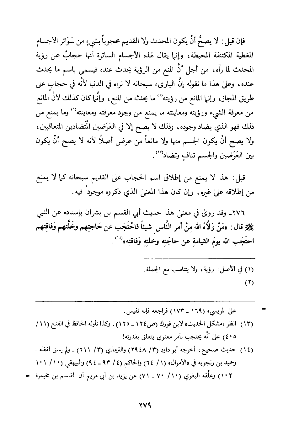 276 - وَقَدْ رَوَى فِي مَعْنَى هَذَا الْحِديثِ أَبُو الْقَاسِمِ بْنُ بُشْرَانَ بِإِسْنَادِهِ، عَنِ النَّبِيِّ صَلَّى اللَّهُ عَلَيْهِ وَسَلَّمَ قَالَ: " مَنْ وَلاهُ اللَّهُ مِنْ أَمْرِ النَّاسِ شَيْئًا فَاحْتَجَبَ عَنْ حَاجَتِهِمْ وَخَلَّتِهِمْ وَفَاقَتِهِمْ احْتَجَبَ اللَّهُ يَوْمَ الْقِيَامَةِ عَنْ حَاجَتِهِ وَخَلَّتِهِ وَفَاقَتِهِ "