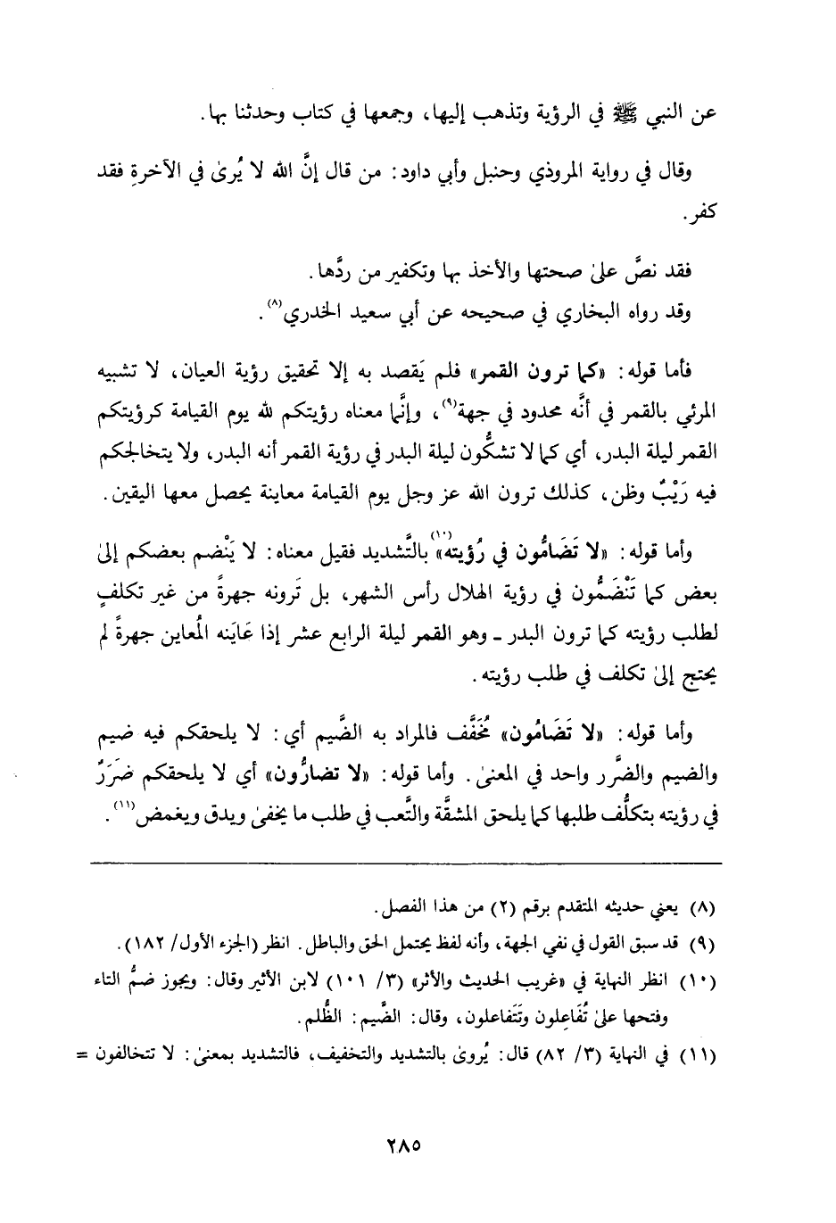 صَلَّى اللَّهُ عَلَيْهِ وَسَلَّمَ فِي الرُّؤْيَةِ وَتَذْهَبُ إِلَيْهَا؟ وَجَمَعَهَا فِي كِتَابٍ وَحَدَّثَنَا بِهَا وَقَالَ فِي رِوَايَةِ الْمَرُّوذِيِّ وَحَنْبَلٍ وَأَبِي دَاوُدَ: مَنْ قَالَ إِنَّ اللَّهَ لا يُرَى فِي الآخِرَةِ فَقَدْ كَفَرَ فَقَدْ نَصَّ عَلَى صِحَّتِهَا وَالأَخْذِ بِهَا وَتَكْفِيرِ مَنْ رَدَّهَا وَقَدْ رَوَاهُ الْبُخَارِيُّ فِي صَحِيحِهِ عَنْ أَبِي سَعِيدٍ الْخُدْرِيِّ فَأَمَّا قَوْلُهُ: " كَمَا تَرَوْنَ الْقَمَرَ " فَلَمْ يَقْصِدْ بِهِ إِلا تَحْقِيقَ رُؤْيَةِ الْعَيَانِ، لا تَشْبِيهَ الْمَرْئِيِّ بِالْقَمَرِ فِي أَنَّهُ مَحْدُودٌ فِي جِهَةٍ، وَإِنَّمَا مَعْنَاهُ رُؤْيَتُكُمْ للَّهِ يَوْمَ الْقِيَامَةِ كَرُؤْيَتِكُمُ الْقَمَرِ لَيْلَةِ الْبَدْرِ، أَيْ كَمَا لا تَشُكُّونَ لَيْلَةَ الْبَدْرِ فِي رُؤْيَةِ الْقَمَرِ أَنَّهُ الْبَدْرُ، وَلا يَتَخَالَجُكُمْ فِيهِ رَيْبٌ وَظَنٌّ، كَذَلِكَ تَرَوْنَ اللَّهَ عَزَّ وَجَلَّ يَوْمَ الْقِيَامَةِ مُعَايَنَةً يَحْصُلُ مَعَهَا الْيَقِينُ وَأَمَّا قَوْلُهُ: " لا تُضَامُّونَ فِي رُؤْيَتِهِ " بِالتَّشْدِيدِ فَقِيلَ مَعْنَاهُ: لا يَنْضَمُّ بَعْضُكُمْ إِلَى بَعْضٍ كَمَا تَنْضَمُّونَ فِي رُؤْيَةِ الْهِلالِ رَأْسَ الشَّهْرِ، بَلْ تَرَوْنَهُ جَهْرَةً مِنْ غَيْرِ تَكَلُّفٍ لِطَلَبِ رُؤْيَتِهِ كَمَا تَرَوْنَ الْبَدْرَ - وَهُوَ الْقَمَرُ لَيْلَةَ الرَّابِعَ عَشَرَ إِذَا عَايَنَهُ الْمُعَايِنُ جَهْرَةً لَمْ يَحْتَجْ إِلَى تَكَلُّفٍ فِي طَلَبِ رُؤْيَتِهِ وَأَمَّا قَوْلُهُ تَعَالَى: " لا تُضَامُونَ " مُخَفَّفٌ فَالْمُرَادُ بِهِ الضَّيْمُ أَيْ: لا يَلْحَقُكُمْ فِيهِ ضَيْمٌ، وَالضَّيْمُ وَالضَّرَرُ وَاحِدٌ فِي الْمَعْنَى وَأَمَّا قَوْلُهُ: " لا تُضَارُّونَ " أَيْ: لا يَلْحَقُكُمْ ضَرَرٌ فِي رُؤْيَتِهِ بِتَكَلُّفِ طَلَبِهَا كَمَا يَلْحَقُ الْمَشَقَّةُ وَالتَّعَبُ فِي طَلَبِ مَا يَخْفَى وَيَدِقُّ وَيَغْمُضُ