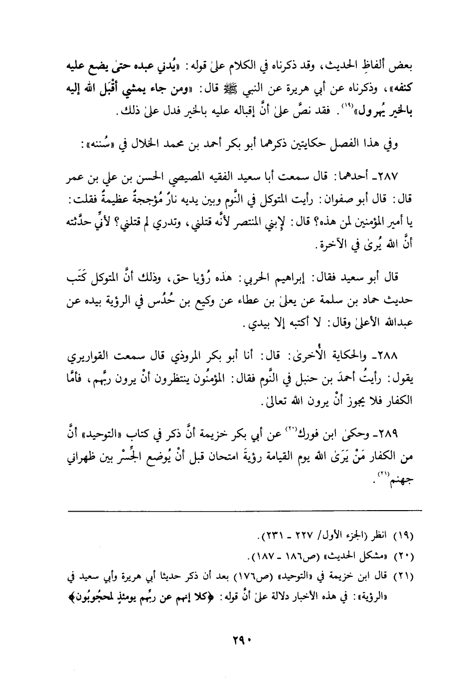 287 - أَحَدُهُمَا: قَالَ: سَمِعْتُ أَبَا سَعِيدٍ الْفَقِيهَ الْمِصِّيصِيَّ الْحَسَنَ بْنَ عَلِيِّ بْنِ عُمَرَ، قَالَ: قَالَ أَبُو صَفْوَانَ: رَأَيْتُ الْمُتَوَكِّلَ فِي النَّوْمِ وَبَيْنَ يَدَيْهِ نَارٌ مُؤَجَّجَةٌ عَظِيمَةٌ فَقُلْتُ: يَا أَمِيرَ الْمُؤْمِنِينَ لِمَنْ هَذِهِ؟ قَالَ: لابْنِي الْمُنْتَصِرِ لأَنَّهُ قَتَلَنِي، وَتَدْرِي لِمَ قَتَلَنِي؟ لأَنِّي حَدَّثْتُهُ أَنَّ اللَّهَ يُرَى فِي الآخِرَةِ قَالَ أَبُو سَعِيدٍ: فَقَالَ إِبْرَاهِيمُ الْحَرْبِيُّ: هَذِهِ رُؤْيَا حَقٍّ، وَذَلِكَ أَنَّ الْمُتَوَكِّلَ كَتَبَ حَدِيثِ حَمَّادِ بْنِ سَلَمَةَ، عَنْ يَعْلَى بْنِ عَطَاءٍ، عَنْ وَكِيعِ بْنِ حُدُسٍ فِي الرُّؤْيَةِ بِيَدِهِ، عَنْ عَبْدِ اللَّهِ الأَعْلَى وَقَالَ: لا أَكْتُبُهُ إِلا بِيَدِي