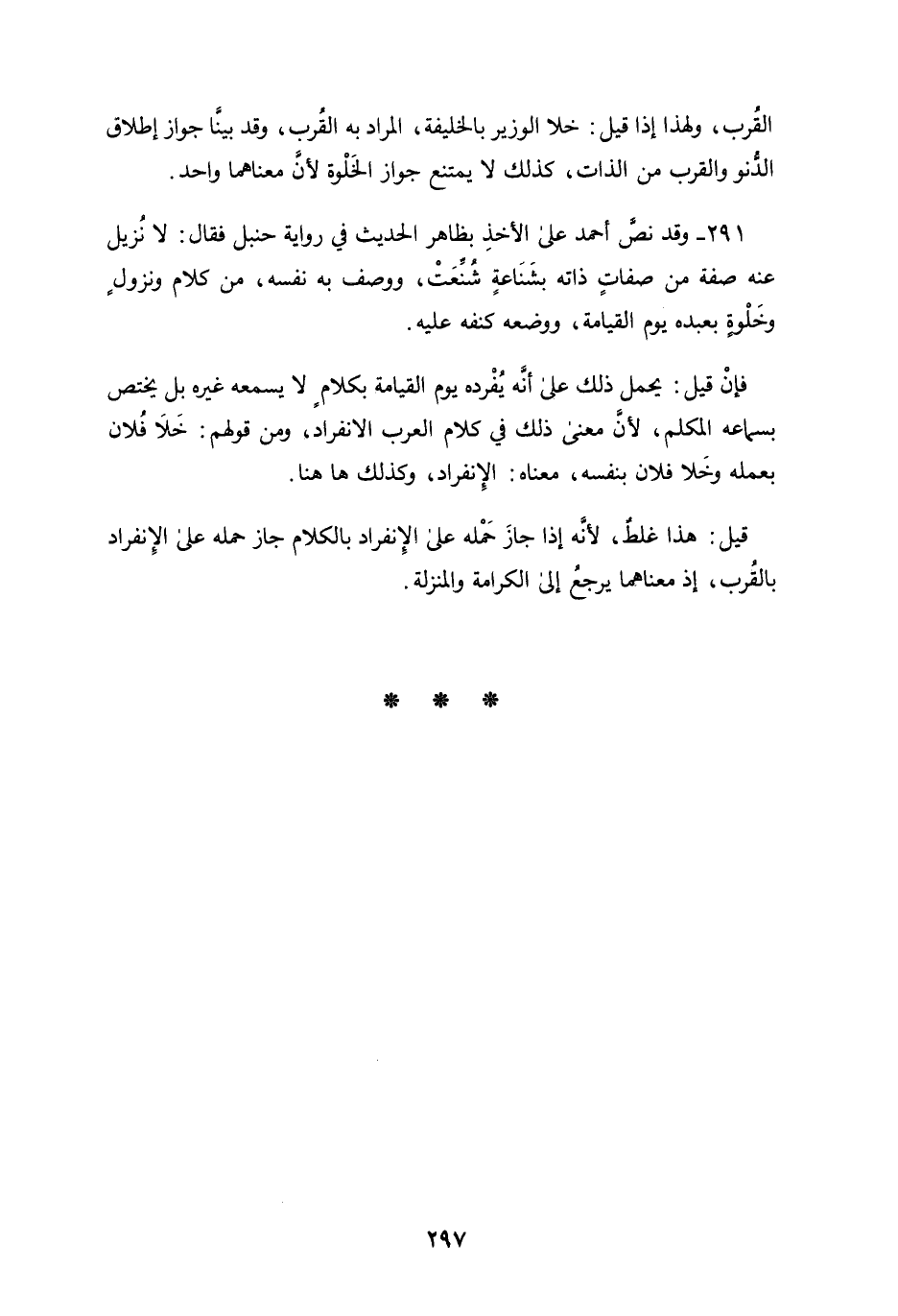 291 - وَقَدْ نَصَّ أَحْمَدُ عَلَى الأَخْذِ بِظَاهِرِ الْحَدِيثِ فِي رِوَايَةِ حَنْبَلٍ فَقَالَ: لا نُزِيلُ عَنْهُ صِفَةً مِنْ صِفَاتِ ذَاتِهِ بِشَنَاعَةٍ شُنِّعَتْ، وَوَصْفٍ وَصَفَ بِهِ نَفْسَهُ، مِنْ كَلامٍ وَنُزُولٍ وَخَلْوَةٍ بِعَبْدِهِ يَوْمَ الْقِيَامَةِ، وَوَضْعِهِ كَنَفِهِ عَلَيْهِ فَإِنْ قِيلَ: يُحْمَلُ ذَلِكَ عَلَى أَنَّهُ يُفْرِدُهُ يَوْمَ الْقِيَامَةِ بِكَلامٍ لا يَسْمَعُهُ غَيْرُهُ بَلْ يَخْتَصُّ بِسَمَاعِهِ الْمُكَلَّمُ، لأَنَّ مَعْنَى ذَلِكَ فِي كَلامِ الْعَرَبِ الانْفِرَادُ، وَمِنْ قَوْلِهِمْ: خَلا فُلانٌ بِعَمَلِهِ وَخَلا فُلانٌ بِنَفْسِهِ، مَعْنَاهُ: الانْفِرَادُ، وَكَذَلِكَ هَهُنَا قِيلَ: هَذَا غَلَطٌ، لأَنَّهُ إِذَا جَازَ حَمْلُهُ عَلَى الانْفِرَادِ بِالْكَلامِ جَازَ حَمْلُهُ عَلَى الانْفِرَادِ بِالْقُرْبِ، إِذْ مَعْنَاهُمَا يَرْجِعُ إِلَى الْكَرَامَةِ وَالْمَنْزِلَةِ