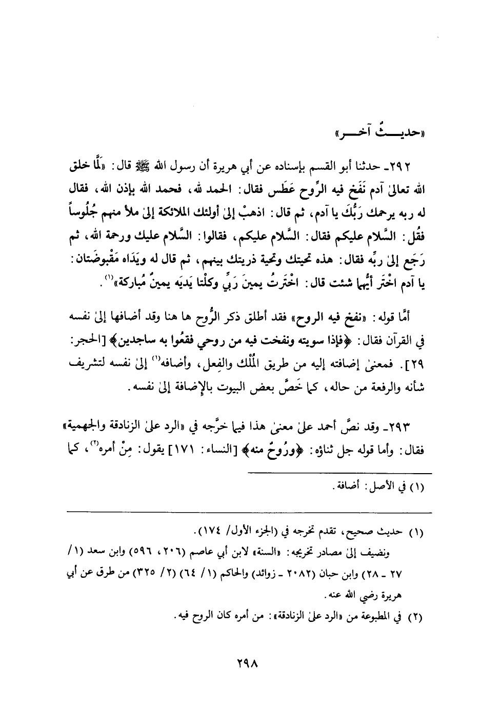 293 - وَقَدْ نَصَّ أَحْمَدُ عَلَى مَعْنَى هَذَا فِيمَا خَرَّجَهُ فِي الرَّدِّ عَلَى الزَّنَادِقَةِ وَالْجَهْمِيَّةِ فَقَال: وَأَمَّا قَوْلُهُ جَلَّ ثَنَاؤُهُ: وَرُوحٌ مِنْهُ سورة النساء آية يَقُولُ: مِنْ أَمْرِهِ، كَمَا
