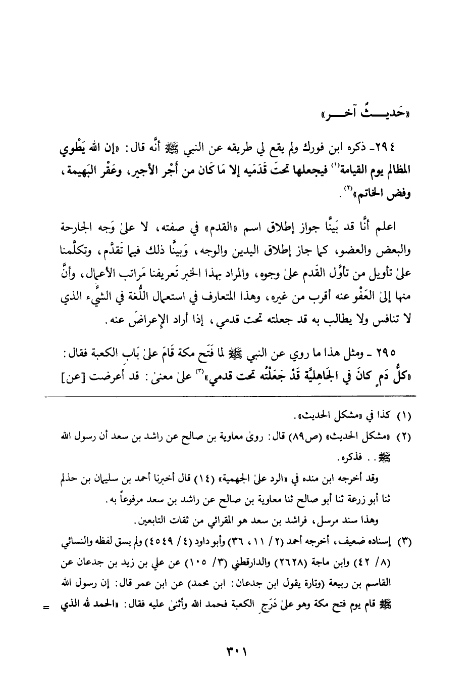 294 - ذكره ابن فورك ولم يقع لي طريقه عَنِ النَّبِيِّ صَلَّى اللَّهُ عَلَيْهِ وَسَلَّمَ أَنَّهُ قَالَ: " إن اللَّه يطوي المظالم يوم القيامة فيجعلها تحت قدميه إِلا مَا كان من أجر الأجير، وعقر البهيمة، وفض الخاتم " اعلم أنا قد بينا جواز إطلاق اسم القدم فِي صفته، لا عَلَى وجه الجارحة والبعض والعضو، كَمَا جاز إطلاق اليدين والوجه، وبينا ذلك فيما تقدم، وتكلمنا عَلَى تأويل من تأول القدم عَلَى وجوه، والمراد بهذا الخبر تعريفنا مراتب الأعمال، وأن منها إِلَى العفو عَنْهُ أقرب من غيره، وَهَذَا المتعارف فِي استعمال اللغة فِي الشيء الَّذِي لا تنافس وَلا يطالب به قد جعلته تحت قدمي، إِذَا أراد الإعراض عَنْهُ