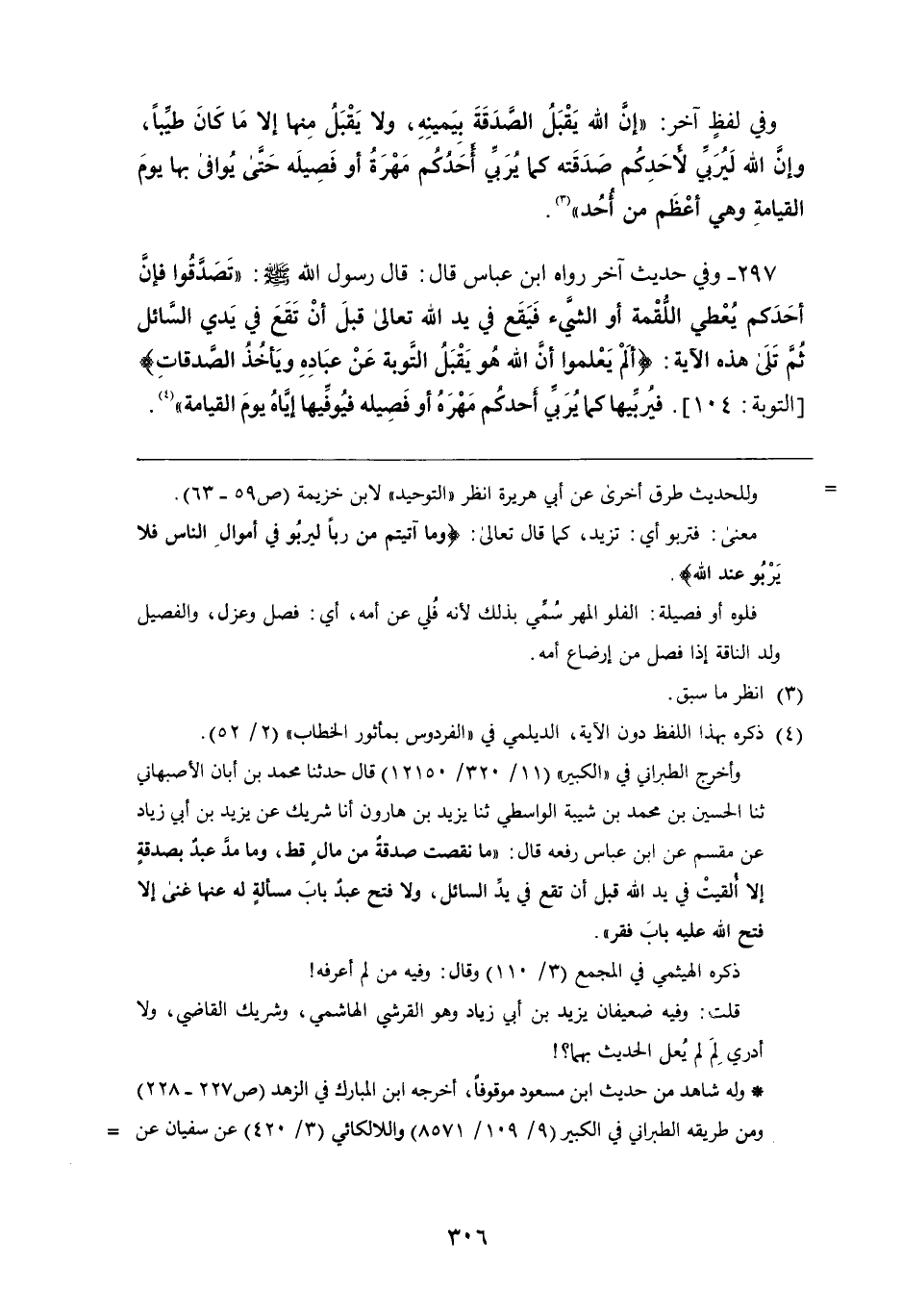 297 - وَفِي حديث آخر رَوَاهُ ابن عباس قَالَ: قَالَ رَسُول اللَّهِ صَلَّى اللَّهُ عَلَيْهِ وَسَلَّمَ: " تصدقوا فإن أحدكم يعطي اللقمة أو الشيء فيقع فِي يد اللَّه تَعَالَى قبل أن تقع فِي يدي السائل، ثُمَّ تلى هَذِهِ الآية: {أَلَمْ يَعْلَمُوا أَنَّ اللَّهَ هُوَ يَقْبَلُ التَّوْبَةَ عَنْ عِبَادِهِ وَيَأْخُذُ الصَّدَقَاتِ} فيربيها كَمَا يربي أحدكم مهره أو فصيله فيوفيها إياه يوم القيامة "