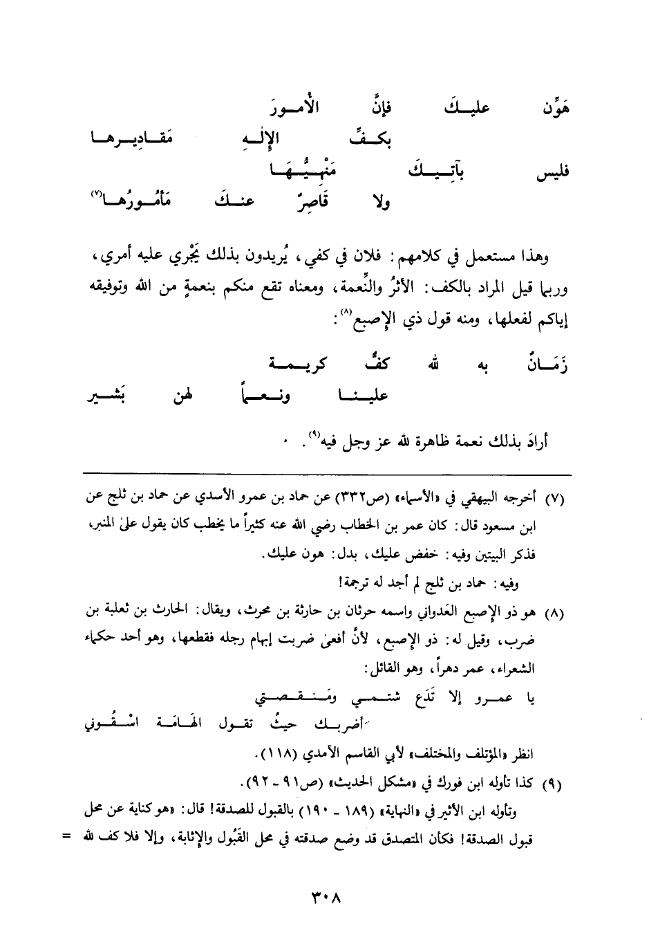 زمان به لله كف كريمة ... علينا ونعما لهن بشير أراد بذلك نعمة ظاهرة لله عَزَّ وَجَلَّ فِيهِ