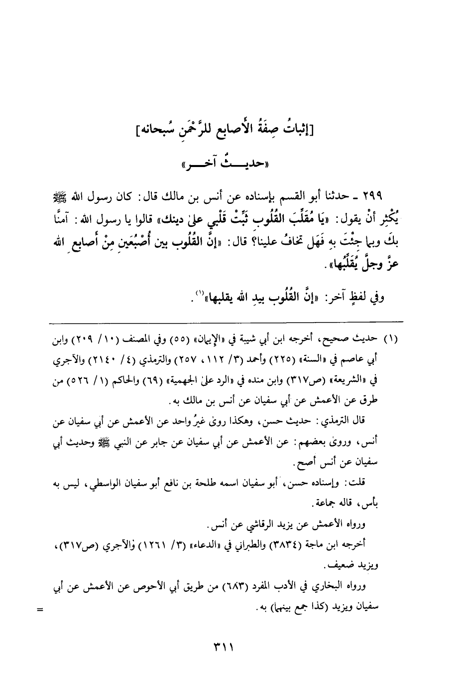 299 - حَدَّثَنَا أَبُو القسم بِإِسْنَادِهِ، عَن أنس بْن مالك، قَالَ: كان رَسُول اللَّهِ صَلَّى اللَّهُ عَلَيْهِ وَسَلَّمَ يكثر أن يقول: " يَا مقلب القلوب ثبت قلبي عَلَى دينك " قالوا: يَا رَسُول اللَّهِ آمنا بك وبما جئت به فهل تخاف علينا؟ قَالَ: " إن القلوب بين أصبعين من أصابع اللَّه عَزَّ وَجَلَّ يقلبها " وَفِي لَفْظٍ آخَرَ: " إن القلوب بيد اللَّه يقلبها "