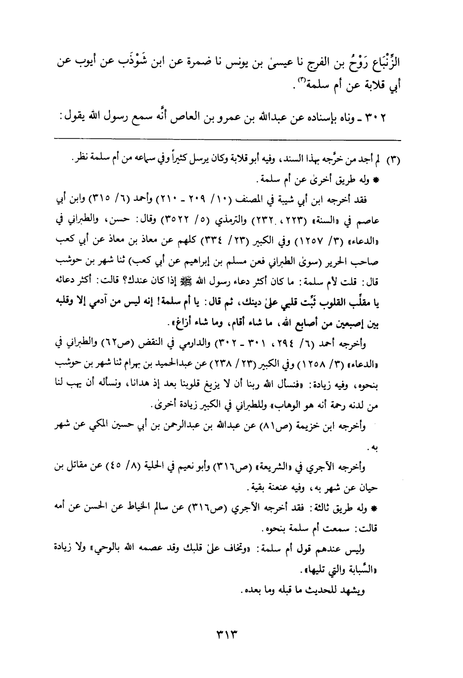 الزِّنْبَاعِ رَوْحُ بْنُ الْفَرَجِ، نا عِيسَى بْنُ يُونُسَ، نا ضَمْرَةُ، عَنِ ابْنِ شَوْذَبٍ، عَنْ أَيُّوبَ، عَنْ أَبِي قِلابَةَ، عَنْ أُمِّ سَلَمَةَ -