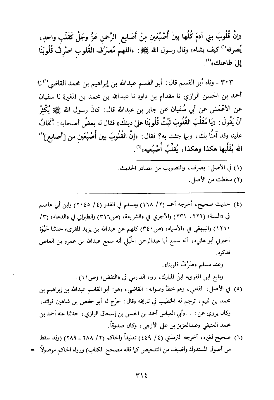 303 - وَناهُ أَبُو الْقَاسِمِ قَالَ: أَبُو الْقَاسِمِ عَبْدُ اللَّهِ بْنُ إِبْرَاهِيمَ بْنِ مُحَمَّدٍ الْقَاضِي، نا أَحْمَدُ بْنُ الْحَسَنِ الرَّازِيُّ، نا مِقْدَامُ بْنُ دَاوُدَ، نا عَبْدُ اللَّهِ بْنُ مُحَمَّدِ بْنِ الْمُغِيرَةِ، نا سُفْيَانُ، عَنِ الأَعْمَشِ، عَنْ أَبِي سُفْيَانَ، عَنْ جَابِرِ بْنِ عَبْدِ اللَّهِ قَالَ: كَانَ رَسُولُ اللَّهِ صَلَّى اللَّهُ عَلَيْهِ وَسَلَّمَ يُكْثِرُ أَنْ يَقُولَ: " يَا مُقَلِّبَ الْقُلُوبِ ثَبِّتْ قُلُوبَنَا عَلَى دِينِكَ "، فَقَالَ لَهُ بَعْضُ أَصْحَابِهِ: أَتَخَافُ عَلَيْنَا وَقَدْ آمَنَّا بِكَ، وَبِمَا جِئْتَ بِهِ؟ فَقَالَ: " إِنَّ الْقُلُوبَ بَيْنَ أُصْبُعَيْنِ مِنْ أَصَابِعِ اللَّهِ يُقَلِّبُهَا هَكَذَا وَهَكَذَا، يُقَلِّبُ أُصْبُعَيْهِ "