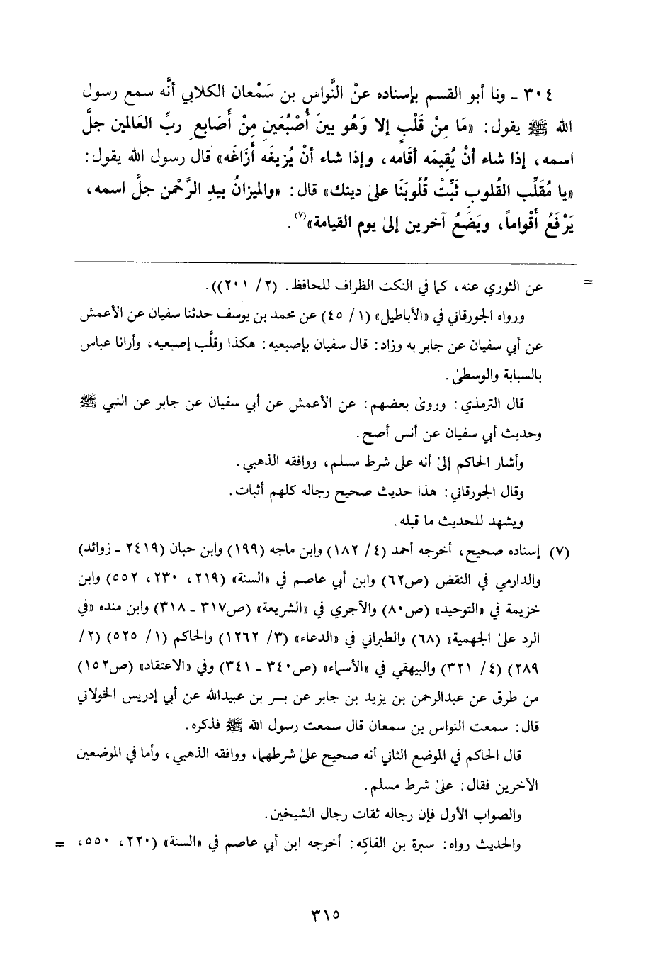 304 - ونا أَبُو القسم بِإِسْنَادِهِ، عَن النواس بْن سمعان الكلابي، أَنَّهُ سمع رَسُول اللَّهِ صَلَّى اللَّهُ عَلَيْهِ وَسَلَّمَ يقول: " مَا من قلب إِلا وَهُوَ بين أصبعين من أصابع رب العالمين جل اسمه، إِذَا شاء أن يقيمه أقامه، وإذا شاء أن يزيغه أزاغه "، قَالَ رَسُول اللَّهِ صَلَّى اللَّهُ عَلَيْهِ وَسَلَّمَ يقول: " يَا مقلب القلوب ثبت قلوبنا عَلَى دينك "، قَالَ: " والميزان بيد الرَّحْمَنِ جل اسمه، يرفع أقواما، ويضع آخرين إِلَى يوم القيامة "