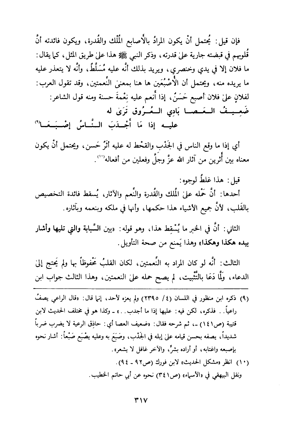 فإن قِيلَ: يحتمل أَنْ يَكُونَ المراد بالأصابع الملك والقدرة، ويكون فائدته أن قلوبهم فِي قبضته جارية عَلَى قدرته، وَذَكَرَ النبي صَلَّى اللَّهُ عَلَيْهِ وَسَلَّمَ هَذَا عَلَى طريق المثل، كَمَا يقال: مَا فلان إِلا فِي يدي وخنصري ويريد بذلك أَنَّهُ عَلَيْهِ مسلط، وأنه لا يتعذر عَلَيْهِ مَا يريده مِنْهُ، ويحتمل أن الأصبعين ها هنا بمعنى النعمتين، وقد تقول العرب: لفلان عَلَى فلان أصبع حسن، إِذَا أنعم عَلَيْهِ نعمة حسنة وَمِنْهُ قول الشاعر: