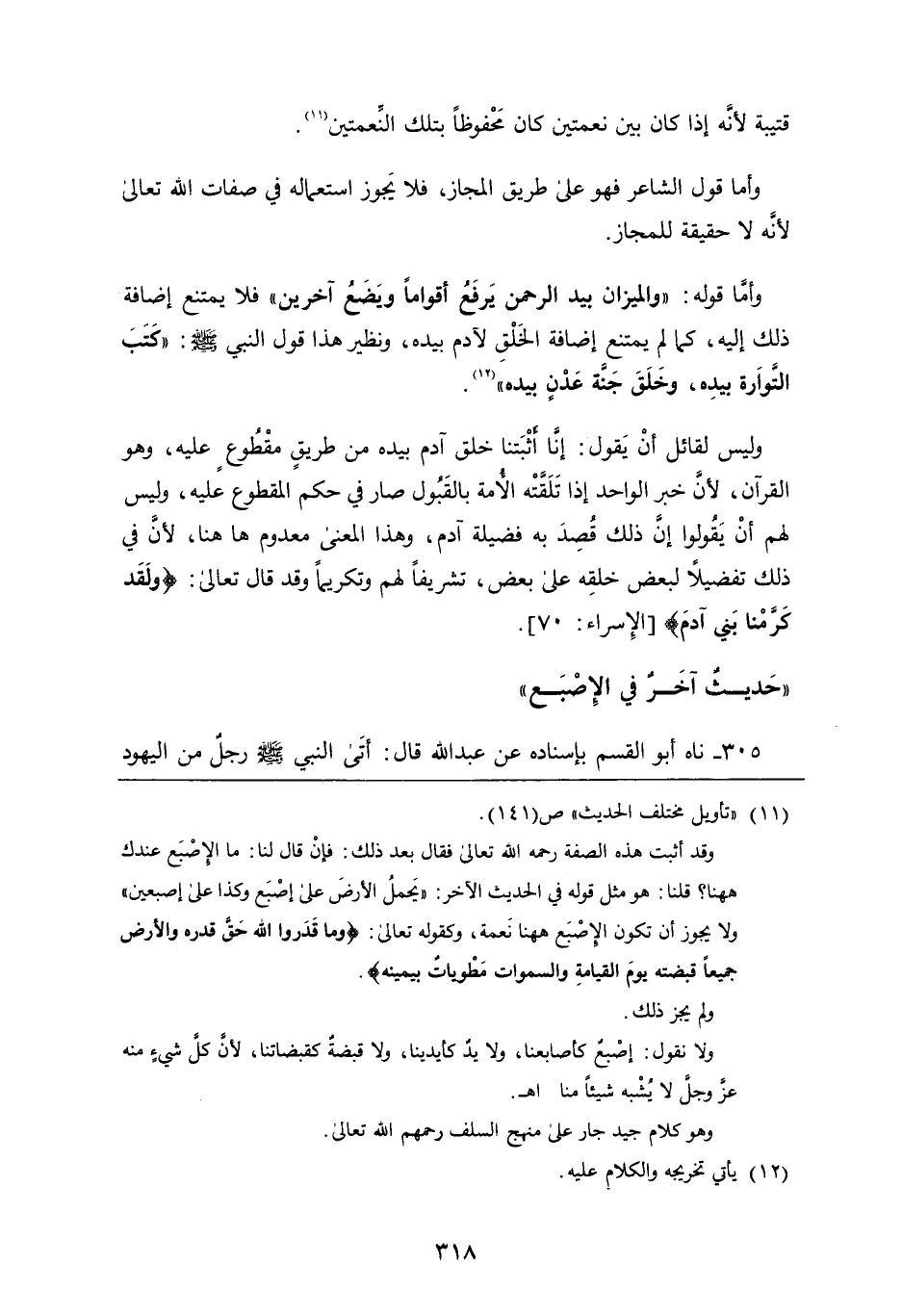 قتيبة لأَنَّهُ إِذَا كان بين نعمتين كان محفوظا بتلك النعمتين وأما قول الشاعر فهو عَلَى طريق المجاز، فلا يجوز استعماله فِي صفات اللَّه تَعَالَى لأَنَّهُ لا حقيقة للمجاز وأما قوله: " والميزان بيد الرَّحْمَنِ يرفع أقواما ويضع آخرين " فلا يمتنع إضافة ذلك إِلَيْهِ، كَمَا لَمْ يمتنع إضافة الخلق لآدم بيده، ونظير هَذَا قول النبي صَلَّى اللَّهُ عَلَيْهِ وَسَلَّمَ: " كتب التوراة بيده، وخلق جنة عدن بيده " وليس لقائل أن يقول: إنا أثبتنا خلق آدم بيده من طريق مقطوع عَلَيْهِ وَهُوَ القرآن، لأَنَّ خبر الواحد إِذَا تلقته الأمة بالقبول صار فِي حكم المقطوع عَلَيْهِ، وليس لهم أن يقولوا إن ذلك قصد به فضيلة آدم، وَهَذَا المعنى معدوم ها هنا، لأَنَّ فِي ذلك تفضيلا لبعض خلقه عَلَى بعض، تشريفا لهم وتكريما، وقد قَالَ تَعَالَى: {وَلَقَدْ كَرَّمْنَا بَنِي آدَمَ} حديث آخر فِي الإصبع
