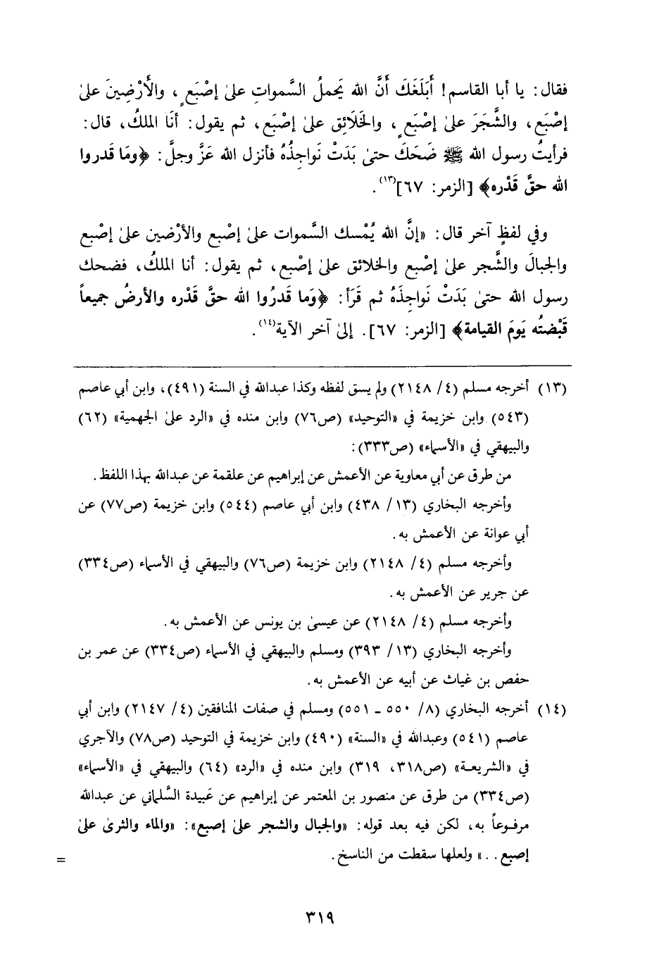 إصبع، والأرضين عَلَى إصبع، والشجر عَلَى إصبع، والخلائق عَلَى إصبع، ثُمَّ يقول: أنا الملك، قَالَ: فرأيت رَسُول اللَّهِ صَلَّى اللَّهُ عَلَيْهِ وَسَلَّمَ ضحك حتى بدت نواجذه، فأنزل اللَّه عَزَّ وَجَلَّ: {وَمَا قَدَرُوا اللَّهَ حَقَّ قَدْرِهِ} وَفِي لَفْظٍ آخَرَ قَالَ: " إن اللَّه يمسك السموات عَلَى إصبع، والأرضين عَلَى إصبع، والجبال والشجر عَلَى إصبع، والخلائق عَلَى إصبع، ثُمَّ يقول: أنا الملك، فضحك رَسُول اللَّهِ صَلَّى اللَّهُ عَلَيْهِ وَسَلَّمَ حتى بدت نواجذه، ثُمَّ قرأ: {وَمَا قَدَرُوا اللَّهَ حَقَّ قَدْرِهِ وَالأَرْضُ جَمِيعًا قَبْضَتُهُ يَوْمَ الْقِيَامَةِ} إِلَى آخر الآية