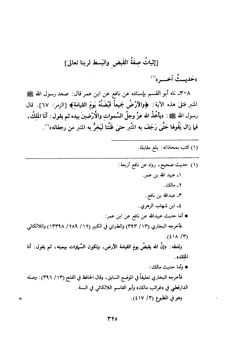 308 - ناه أَبُو القسم بِإِسْنَادِهِ، عَن نافع، عَن ابن عمر قَالَ: صعد رَسُول اللَّهِ صَلَّى اللَّهُ عَلَيْهِ وَسَلَّمَ المنبر فتلى هَذِهِ الآية: {وَالأَرْضُ جَمِيعًا قَبْضَتُهُ يَوْمَ الْقِيَامَةِ} قَالَ رَسُول اللَّهِ صَلَّى اللَّهُ عَلَيْهِ وَسَلَّمَ: " يأخذ اللَّه عَزَّ وَجَلَّ السموات والأرضين بيده ثُمَّ يقول: أنا الملك، فما زال يقولها حتى رجف به المنبر حتى ظننا ليخر به المنبر من رجفانه "