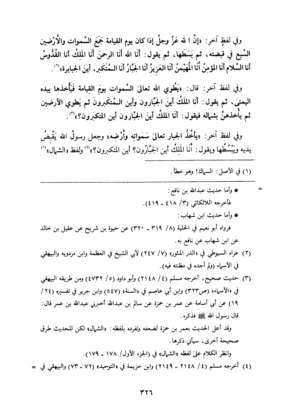 وَفِي لَفْظٍ آخَرَ: " إن اللَّه عَزَّ وَجَلَّ إِذَا كان يوم القيامة جمع السموات والأرضين السبع فِي قبضته، ثُمَّ بسطها، ثُمَّ يقول: أنا اللَّه أنا الرَّحْمَنِ أنا الملك أنا القدوس أنا السلام أنا المؤمن أنا المهيمن أنا العزيز أنا الجبار أنا المتكبر، أين الجبابرة " وَفِي لَفْظٍ آخَرَ: قَالَ: " يطوي اللَّه تَعَالَى السموات يوم القيامة فيأخذها بيده اليمنى، ثُمَّ يقول: أنا الملك أين الجبارون وأين المتكبرون ثُمَّ يطوي الأرضين ثُمَّ يأخذهن بشماله فيقول: أنا الملك أين الجبارون أين المتكبرون؟ " وَفِي لَفْظٍ آخَرَ: " يأخذ الجبار تَعَالَى سمواته وأرضه " وجعل رَسُول اللَّهِ صَلَّى اللَّهُ عَلَيْهِ وَسَلَّمَ يقبض يديه ويبسطها ويقول: أنا الملك أين الجبارون؟ أين المتكبرون؟ ولفظ الشمال