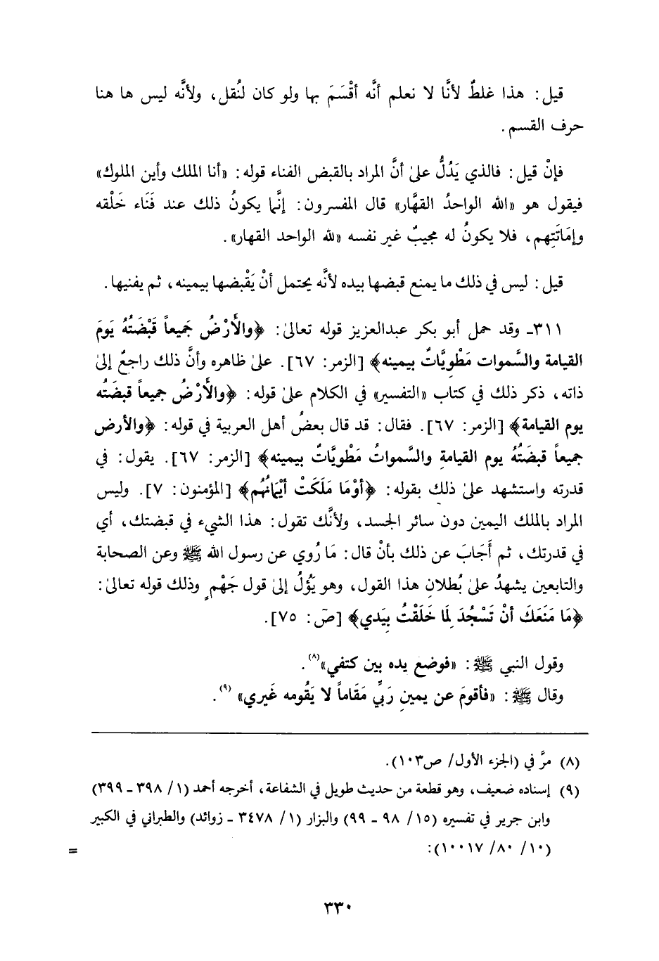 311 - وقد حمل أَبُو بكر عبد العزيز قوله تَعَالَى: {وَالأَرْضُ جَمِيعًا قَبْضَتُهُ يَوْمَ الْقِيَامَةِ وَالسَّمَوَاتُ مَطْوِيَّاتٌ بِيَمِينِهِ} عَلَى ظاهره وأن ذلك راجع إِلَى ذاته، ذكر ذلك فِي كتاب التفسير فِي الكلام عَلَى قوله: {وَالأَرْضُ جَمِيعًا قَبْضَتُهُ يَوْمَ الْقِيَامَةِ} فَقَالَ: قد قَالَ بعض أهل العربية فِي قوله: {وَالأَرْضُ جَمِيعًا قَبْضَتُهُ يَوْمَ الْقِيَامَةِ وَالسَّمَوَاتُ مَطْوِيَّاتٌ بِيَمِينِهِ} يقول: فِي قدرته واستشهد عَلَى ذلك بقوله: {أَوْ مَا مَلَكَتْ أَيْمَانُهُمْ} وليس المراد بالملك اليمين دون سائر الجسد، ولأنك تقول: هَذَا الشيء فِي قبضتك، أي فِي قدرتك، ثُمَّ أجاب عَن ذلك بأن