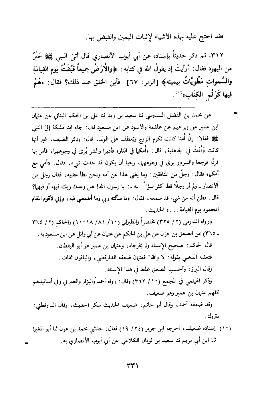 312 - ثُمَّ ذكر حديثا بِإِسْنَادِهِ، عَن أَبِي أيوب الأنصاري قَالَ: أتى النبي صَلَّى اللَّهُ عَلَيْهِ وَسَلَّمَ حبر من اليهود فَقَالَ: أرأيت إذ يقول اللَّه فِي كتابه: {وَالأَرْضُ جَمِيعًا قَبْضَتُهُ يَوْمَ الْقِيَامَةِ وَالسَّمَوَاتُ مَطْوِيَّاتٌ بِيَمِينِهِ} فأين الخلق عند ذلك؟ فَقَالَ: " هم فيها كرقم الكتاب "