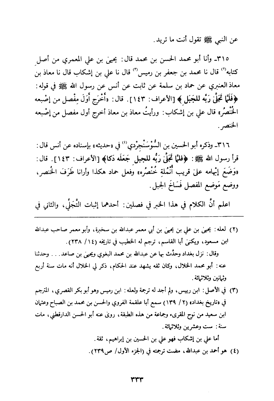 316 - وذكره أَبُو الحسين بْن السوسنجردي فِي حديثه بِإِسْنَادِهِ، عَن أنس قَالَ: قرأ رَسُول اللَّهِ صَلَّى اللَّهُ عَلَيْهِ وَسَلَّمَ: {فَلَمَّا تَجَلَّى رَبُّهُ لِلْجَبَلِ جَعَلَهُ دَكًّا} قَالَ: " وضع إبهامه عَلَى قريب أنملة خنصره " وفعل حماد هكذا وأرانا طرف الخنصر، ووضع موضع المفصل فساخ الجبل اعلم أن الكلام فِي هَذَا الخبر فِي فصلين: أحدهما إثبات التجلي، والثاني فِي
