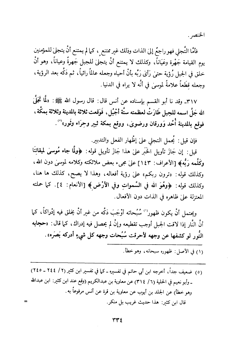 317 - وقد نا أَبُو القسم بِإِسْنَادِهِ، عَن أنس قَالَ: قَالَ رَسُول اللَّهِ صَلَّى اللَّهُ عَلَيْهِ وَسَلَّمَ: " لما تجلى اللَّه جل اسمه للجبل طارت لعظمته ستة أجبل، فوقعت ثلاثة بالمدينة وثلاثة بمكة، فوقع بالمدينة أحد وورقان ورضوى، ووقع بمكة ثبير وحراء وثور " فإن قِيلَ: يحمل التجلي عَلَى إظهار الفعل والتدبير قيل: إن جاز تأويل الخبر عَلَى هَذَا جاز تأويل قوله: {وَلَمَّا جَاءَ مُوسَى لِمِيقَاتِنَا وَكَلَّمَهُ رَبُّهُ} عَلَى مجيء بعض ملائكته وكلامه لموسى دون اللَّه، وكذلك قوله: " ترون ربكم