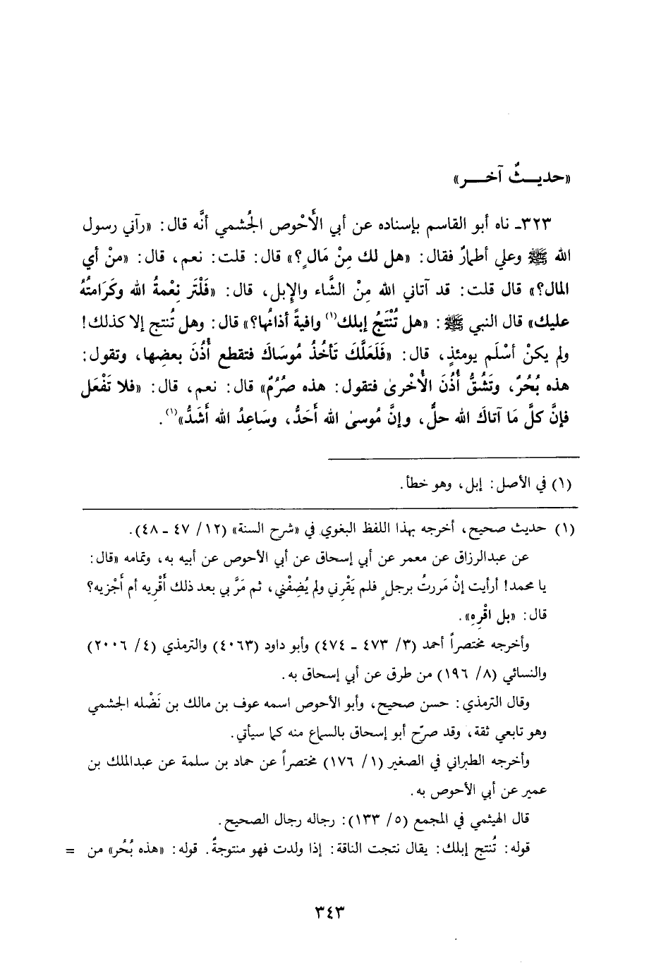 323 - ناه أَبُو الْقَاسِم بِإِسْنَادِهِ، عَن أَبِي الأحوص الجشمي، أَنَّهُ قَالَ: " رآني رَسُول اللَّهِ صَلَّى اللَّهُ عَلَيْهِ وَسَلَّمَ وعلي أطمار فَقَالَ: " هل لك من مال؟ " قَالَ: