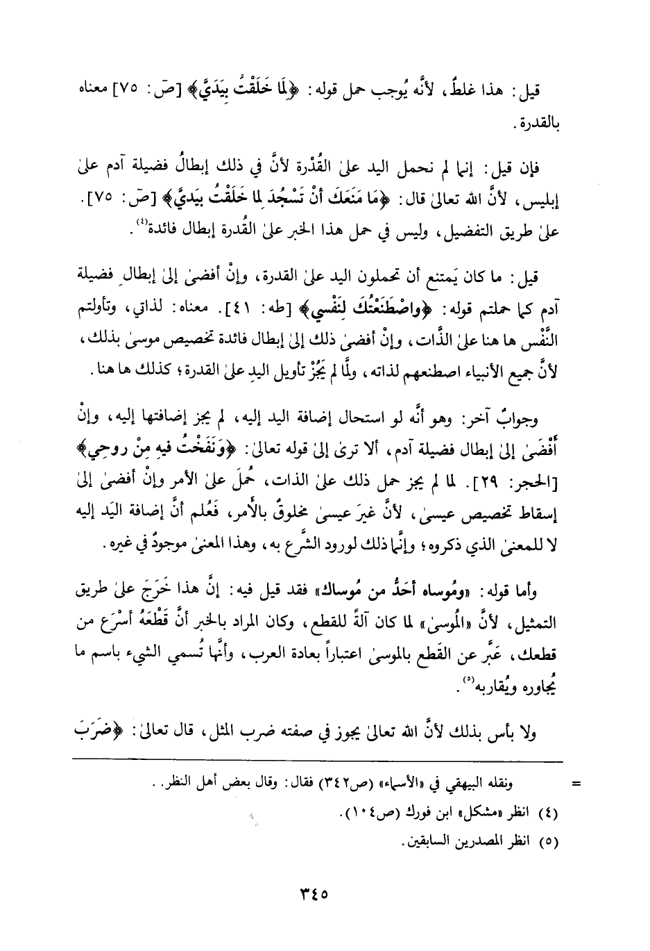 قيل: هَذَا غلط، لأَنَّهُ يوجب حمل قوله: {لِمَا خَلَقْتُ بِيَدَيَّ} معناه بالقدرة فإن قِيلَ: إنما لَمْ نحمل اليد عَلَى القدرة لأَنَّ فِي ذلك إبطال فضيلة آدم عَلَى إبليس، لأَنَّ اللَّه تَعَالَى قَالَ: {مَا مَنَعَكَ أَنْ تَسْجُدَ لِمَا خَلَقْتُ بِيَدَيَّ} على طريق التفضيل، وليس فِي حمل هَذَا الخبر عَلَى القدرة إبطال فائدة قيل: مَا كان يمتنع أن تحملون اليد عَلَى القدرة، وإن أفضى إِلَى إبطال فضيلة آدم كَمَا حملتم قوله: {وَاصْطَنَعْتُكَ لِنَفْسِي} معناه: لذاتي، وتأولتم النفس ها هنا عَلَى الذات، وإن أفضى ذلك إِلَى إبطال فائدة تخصيص مُوسَى بذلك، لأَنَّ جميع الأنبياء اصطنعهم لذاته، ولما لَمْ يجز تأويل اليد عَلَى القدرة كذلك ها هنا وجواب آخر: هُوَ أَنَّهُ لو استحال إضافة اليد إِلَيْهِ، لَمْ يجز إضافتها إِلَيْهِ، وإن أفضى إِلَى إبطال فضيلة آدم، أَلا ترى إِلَى قوله تَعَالَى: {وَنَفَخْتُ فِيهِ مِنْ رُوحِي} لما لَمْ يجز حمل ذلك عَلَى الذات، حمل عَلَى الأمر وإن أفضى إِلَى إسقاط تخصيص عِيسَى، لأَنَّ غير عِيسَى مخلوق بالأمر، فعلم أن إضافة اليد إِلَيْهِ لا للمعنى الَّذِي ذكروه وإنما ذلك لورود الشرع به، وَهَذَا المعنى