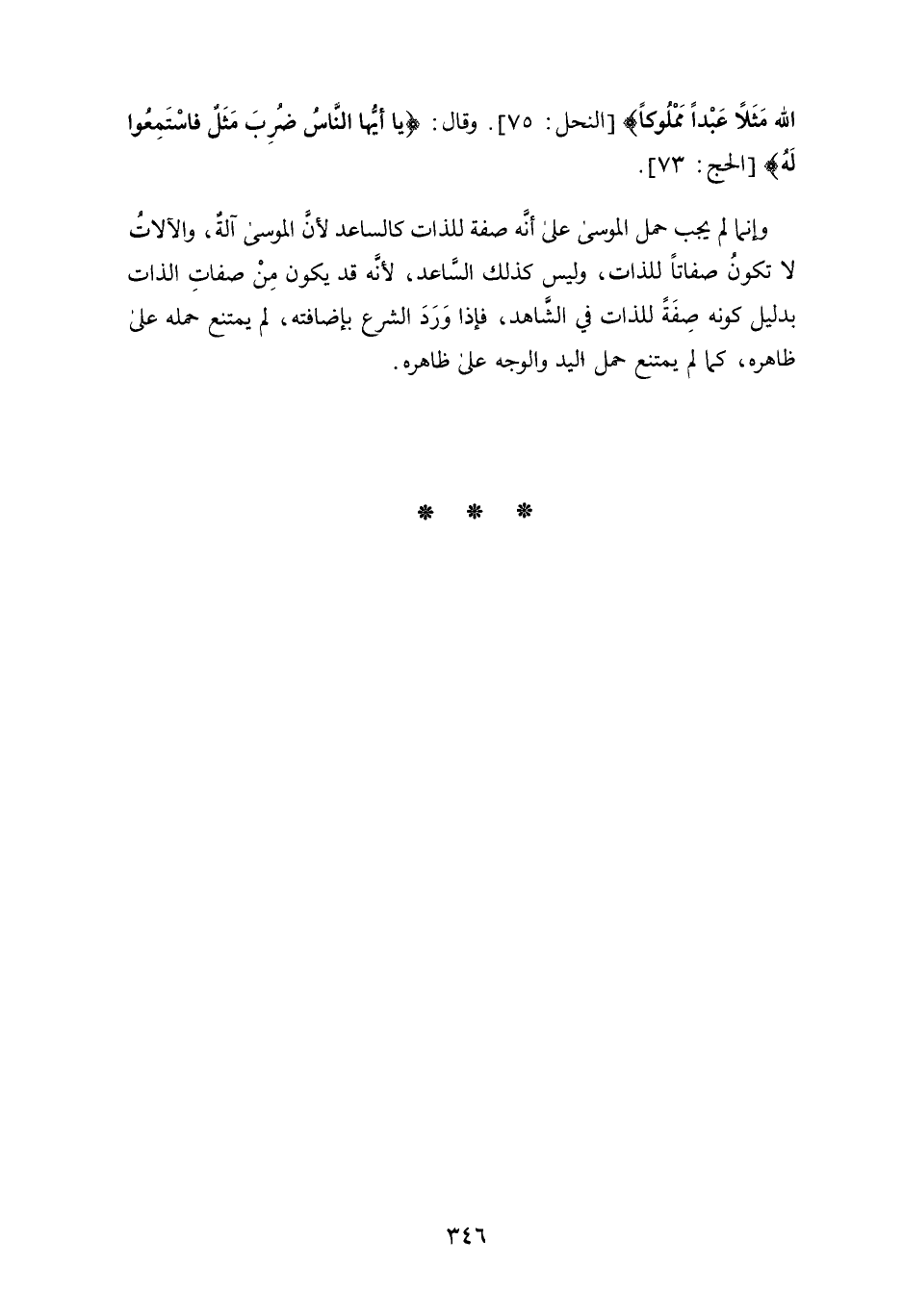 اللَّهُ مَثَلا عَبْدًا مَمْلُوكًا} وَقَالَ: {يَأَيُّهَا النَّاسُ ضُرِبَ مَثَلٌ فَاسْتَمِعُوا لَهُ} وإنما لَمْ يجب حمل الموسى عَلَى أَنَّهُ صفة للذات كالساعد لأَنَّ الموسى آلة، والآلات لا تكون صفاتا للذات، وليس كذلك الساعد، لأَنَّهُ قد يكون من صفات الذات بدليل كونه صفة للذات فِي الشاهد، فإذا ورد الشرع بإضافته، لَمْ يمتنع حمله عَلَى ظاهره، كَمَا لَمْ يمتنع حمل اليد والوجه عَلَى ظاهره